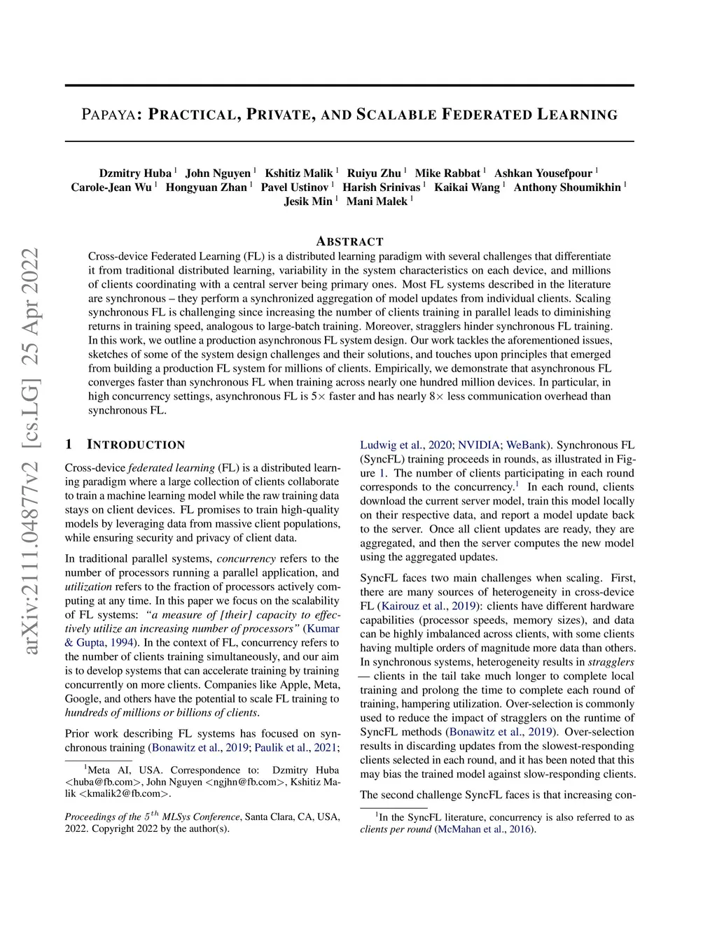 Cross-device Federated Learning (FL) is a distributed learning paradigm with several challenges that differentiate it from traditional distributed learning, variability in the system characteristics on each device, and millions of clients coordinating with a central server being primary ones. Most FL systems described in the literature are synchronous - they perform a synchronized aggregation of model updates from individual clients. Scaling synchronous FL is challenging since increasing the number of clients training in parallel leads to diminishing returns in training speed, analogous to large-batch training. Moreover, stragglers hinder synchronous FL training. In this work, we outline a production asynchronous FL system design. Our work tackles the aforementioned issues, sketches of some of the system design challenges and their solutions, and touches upon principles that emerged from building a production FL system for millions of clients. Empirically, we demonstrate that asynchronous FL converges faster than synchronous FL when training across nearly one hundred million devices. In particular, in high concurrency settings, asynchronous FL is 5x faster and has nearly 8x less communication overhead than synchronous FL.