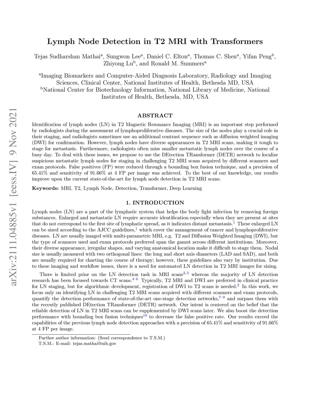 Lymph Node Detection in T2 MRI with Transformers