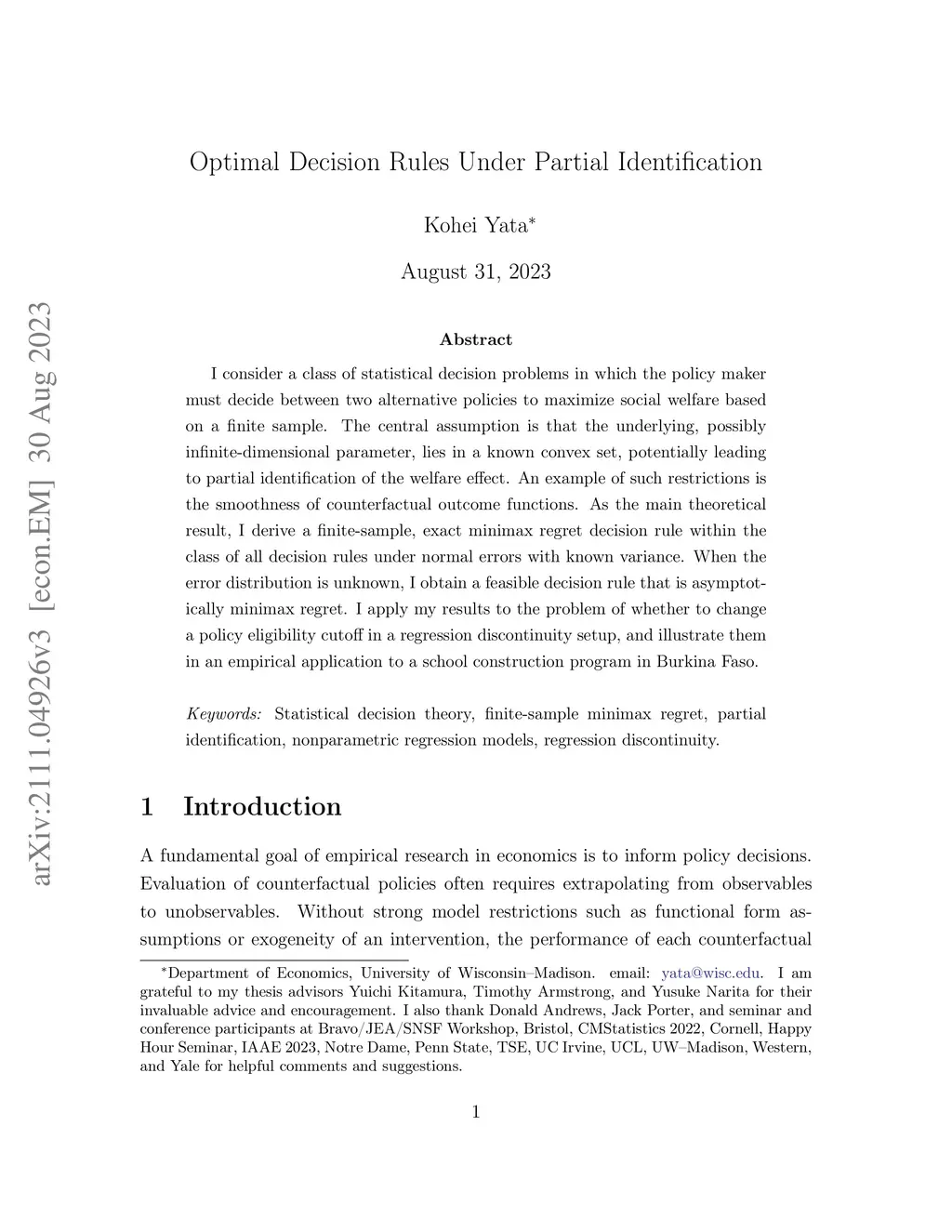 I consider a class of statistical decision problems in which the policy maker must decide between two alternative policies to maximize social welfare based on a finite sample. The central assumption is that the underlying, possibly infinite-dimensional parameter, lies in a known convex set, potentially leading to partial identification of the welfare effect. An example of such restrictions is the smoothness of counterfactual outcome functions. As the main theoretical result, I derive a finite-sample, exact minimax regret decision rule within the class of all decision rules under normal errors with known variance. When the error distribution is unknown, I obtain a feasible decision rule that is asymptotically minimax regret. I apply my results to the problem of whether to change a policy eligibility cutoff in a regression discontinuity setup, and illustrate them in an empirical application to a school construction program in Burkina Faso.