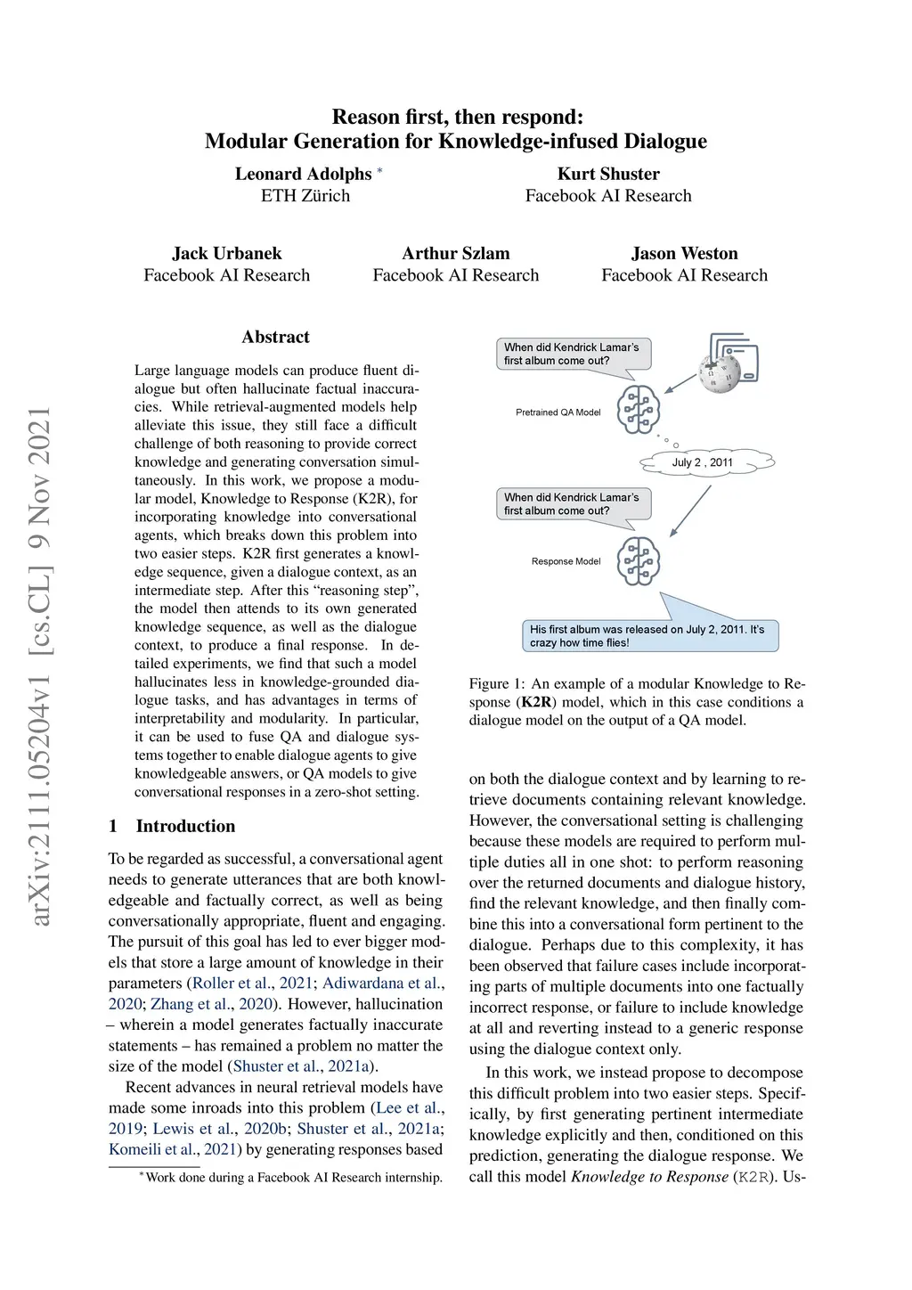 Large language models can produce fluent dialogue but often hallucinate factual inaccuracies. While retrieval-augmented models help alleviate this issue, they still face a difficult challenge of both reasoning to provide correct knowledge and generating conversation simultaneously. In this work, we propose a modular model, Knowledge to Response (K2R), for incorporating knowledge into conversational agents, which breaks down this problem into two easier steps. K2R first generates a knowledge sequence, given a dialogue context, as an intermediate step. After this "reasoning step", the model then attends to its own generated knowledge sequence, as well as the dialogue context, to produce a final response. In detailed experiments, we find that such a model hallucinates less in knowledge-grounded dialogue tasks, and has advantages in terms of interpretability and modularity. In particular, it can be used to fuse QA and dialogue systems together to enable dialogue agents to give knowledgeable answers, or QA models to give conversational responses in a zero-shot setting.