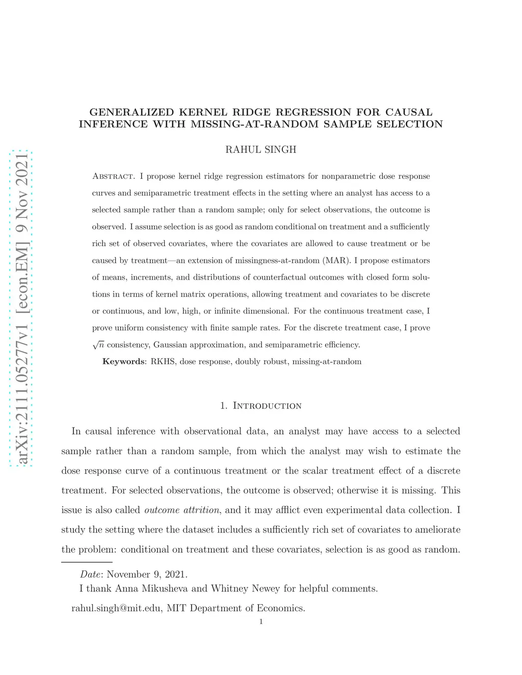 I propose kernel ridge regression estimators for nonparametric dose response curves and semiparametric treatment effects in the setting where an analyst has access to a selected sample rather than a random sample; only for select observations, the outcome is observed. I assume selection is as good as random conditional on treatment and a sufficiently rich set of observed covariates, where the covariates are allowed to cause treatment or be caused by treatment -- an extension of missingness-at-random (MAR). I propose estimators of means, increments, and distributions of counterfactual outcomes with closed form solutions in terms of kernel matrix operations, allowing treatment and covariates to be discrete or continuous, and low, high, or infinite dimensional. For the continuous treatment case, I prove uniform consistency with finite sample rates. For the discrete treatment case, I prove root-n consistency, Gaussian approximation, and semiparametric efficiency.