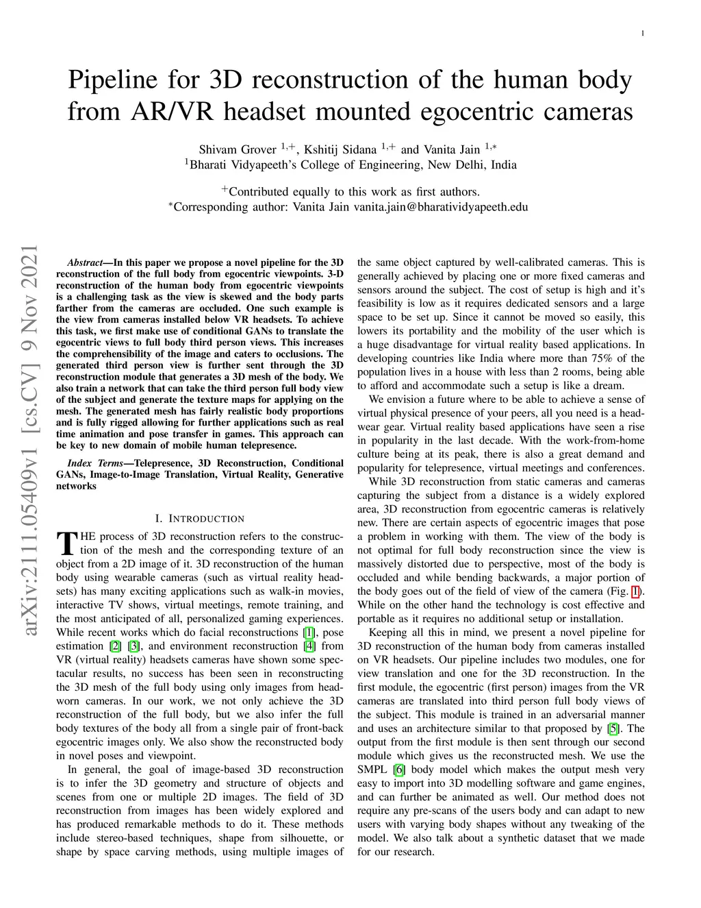 In this paper, we propose a novel pipeline for the 3D reconstruction of the full body from egocentric viewpoints. 3-D reconstruction of the human body from egocentric viewpoints is a challenging task as the view is skewed and the body parts farther from the cameras are occluded. One such example is the view from cameras installed below VR headsets. To achieve this task, we first make use of conditional GANs to translate the egocentric views to full body third-person views. This increases the comprehensibility of the image and caters to occlusions. The generated third-person view is further sent through the 3D reconstruction module that generates a 3D mesh of the body. We also train a network that can take the third person full-body view of the subject and generate the texture maps for applying on the mesh. The generated mesh has fairly realistic body proportions and is fully rigged allowing for further applications such as real-time animation and pose transfer in games. This approach can be key to a new domain of mobile human telepresence.