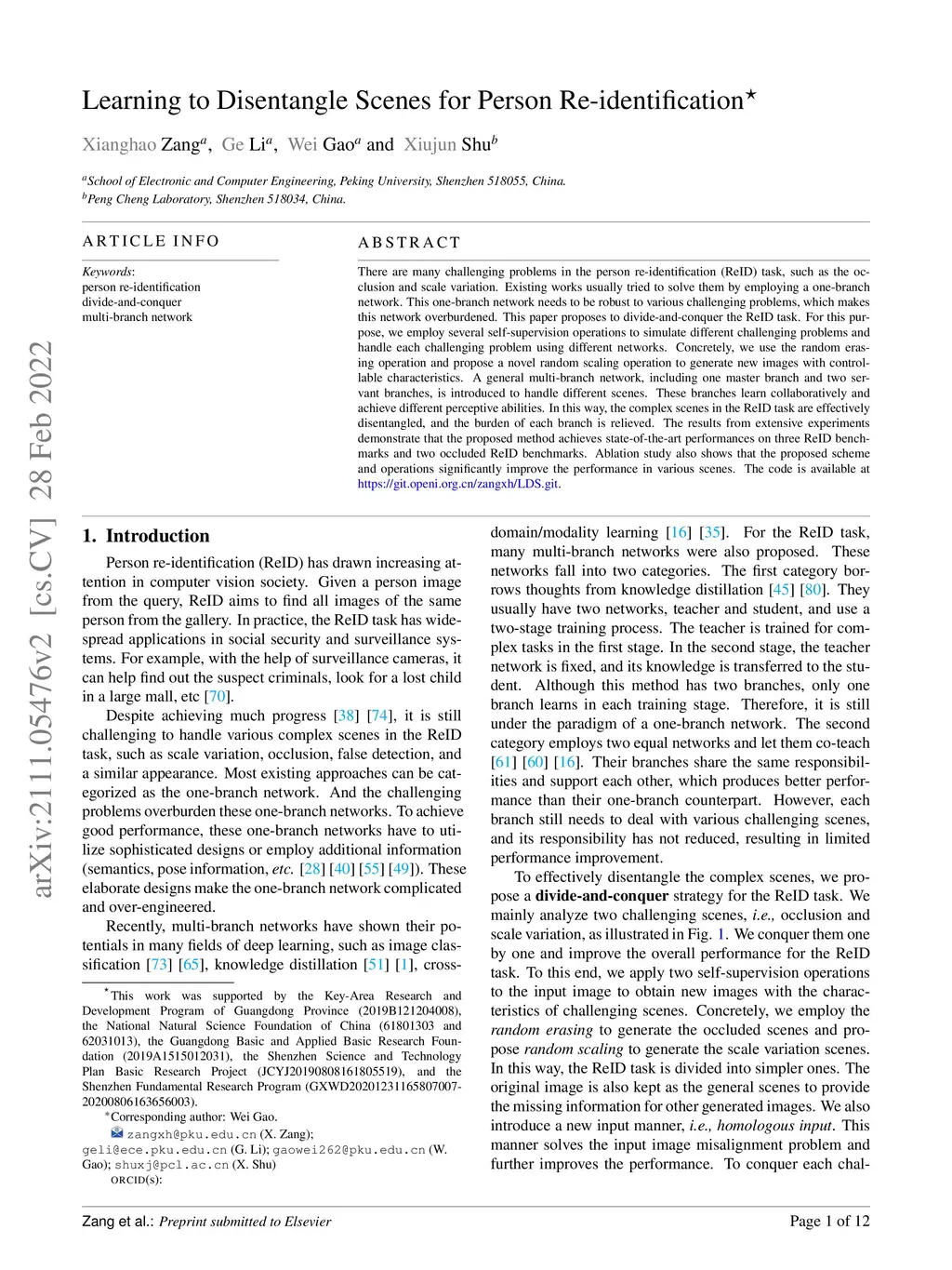There are many challenging problems in the person re-identification (ReID) task, such as the occlusion and scale variation. Existing works usually tried to solve them by employing a one-branch network. This one-branch network needs to be robust to various challenging problems, which makes this network overburdened. This paper proposes to divide-and-conquer the ReID task. For this purpose, we employ several self-supervision operations to simulate different challenging problems and handle each challenging problem using different networks. Concretely, we use the random erasing operation and propose a novel random scaling operation to generate new images with controllable characteristics. A general multi-branch network, including one master branch and two servant branches, is introduced to handle different scenes. These branches learn collaboratively and achieve different perceptive abilities. In this way, the complex scenes in the ReID task are effectively disentangled, and the burden of each branch is relieved. The results from extensive experiments demonstrate that the proposed method achieves state-of-the-art performances on three ReID benchmarks and two occluded ReID benchmarks. Ablation study also shows that the proposed scheme and operations significantly improve the performance in various scenes. The code is available at https://git.openi.org.cn/zangxh/LDS.git.