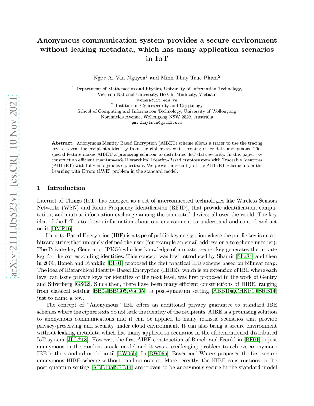 Anonymous Identity Based Encryption (AIBET) scheme allows a tracer to use the tracing key to reveal the recipient's identity from the ciphertext while keeping other data anonymous. This special feature makes AIBET a promising solution to distributed IoT data security. In this paper, we construct an efficient quantum-safe Hierarchical Identity-Based cryptosystem with Traceable Identities (AHIBET) with fully anonymous ciphertexts. We prove the security of the AHIBET scheme under the Learning with Errors (LWE) problem in the standard model.
