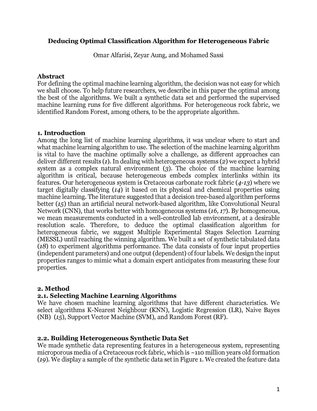 For defining the optimal machine learning algorithm, the decision was not easy for which we shall choose. To help future researchers, we describe in this paper the optimal among the best of the algorithms. We built a synthetic data set and performed the supervised machine learning runs for five different algorithms. For heterogeneous rock fabric, we identified Random Forest, among others, to be the appropriate algorithm.