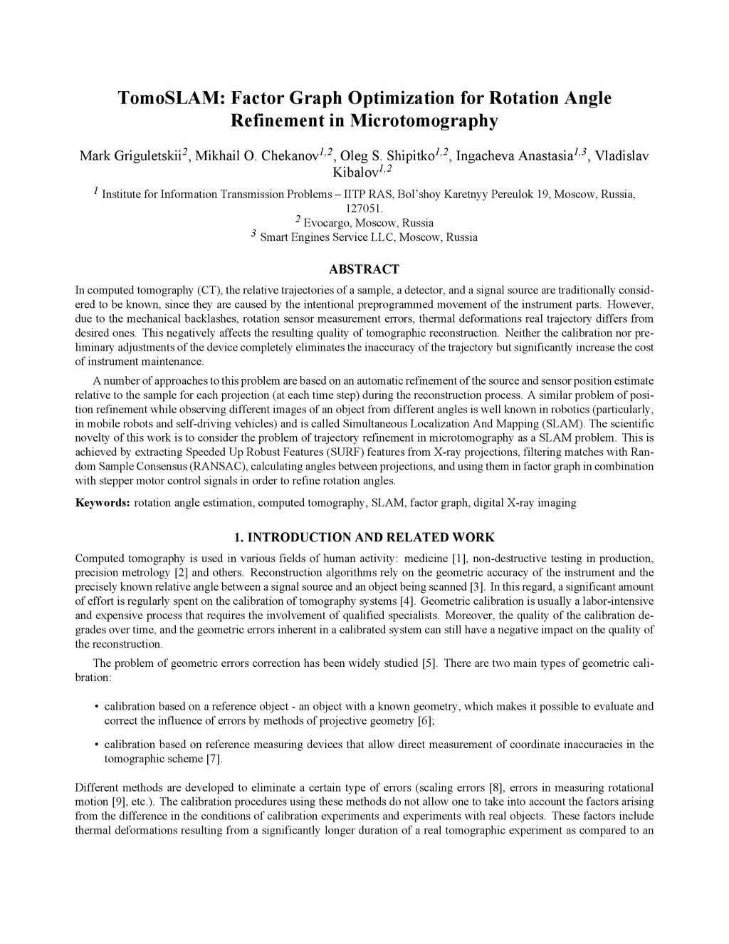 In computed tomography (CT), the relative trajectories of a sample, a detector, and a signal source are traditionally considered to be known, since they are caused by the intentional preprogrammed movement of the instrument parts. However, due to the mechanical backlashes, rotation sensor measurement errors, thermal deformations real trajectory differs from desired ones. This negatively affects the resulting quality of tomographic reconstruction. Neither the calibration nor preliminary adjustments of the device completely eliminates the inaccuracy of the trajectory but significantly increase the cost of instrument maintenance. A number of approaches to this problem are based on an automatic refinement of the source and sensor position estimate relative to the sample for each projection (at each time step) during the reconstruction process. A similar problem of position refinement while observing different images of an object from different angles is well known in robotics (particularly, in mobile robots and self-driving vehicles) and is called Simultaneous Localization And Mapping (SLAM). The scientific novelty of this work is to consider the problem of trajectory refinement in microtomography as a SLAM problem. This is achieved by extracting Speeded Up Robust Features (SURF) features from X-ray projections, filtering matches with Random Sample Consensus (RANSAC), calculating angles between projections, and using them in factor graph in combination with stepper motor control signals in order to refine rotation angles.