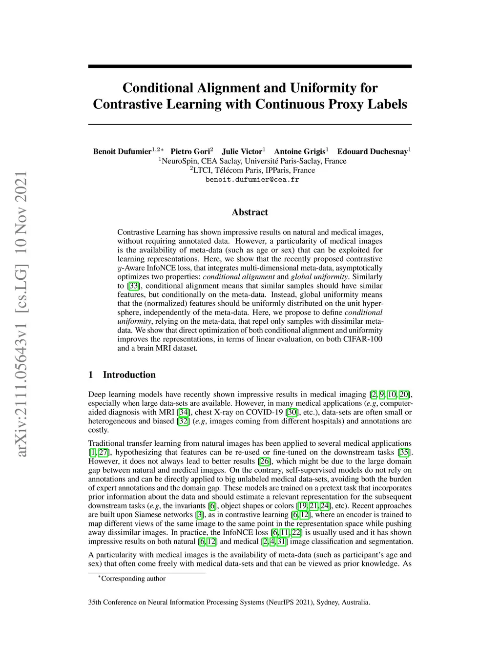 Contrastive Learning has shown impressive results on natural and medical images, without requiring annotated data. However, a particularity of medical images is the availability of meta-data (such as age or sex) that can be exploited for learning representations. Here, we show that the recently proposed contrastive y-Aware InfoNCE loss, that integrates multi-dimensional meta-data, asymptotically optimizes two properties: conditional alignment and global uniformity. Similarly to [Wang, 2020], conditional alignment means that similar samples should have similar features, but conditionally on the meta-data. Instead, global uniformity means that the (normalized) features should be uniformly distributed on the unit hyper-sphere, independently of the meta-data. Here, we propose to define conditional uniformity, relying on the meta-data, that repel only samples with dissimilar meta-data. We show that direct optimization of both conditional alignment and uniformity improves the representations, in terms of linear evaluation, on both CIFAR-100 and a brain MRI dataset.