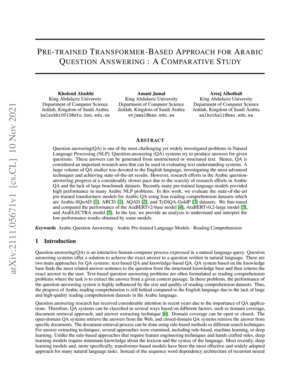 Pre-trained Transformer-Based Approach for Arabic Question Answering : A Comparative Study