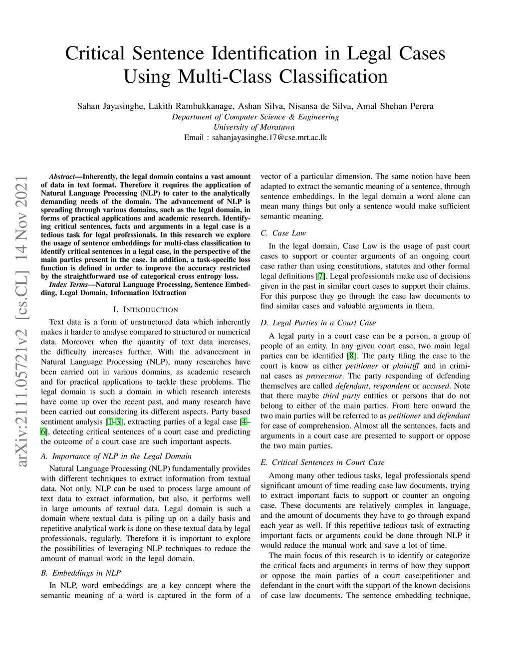 Inherently, the legal domain contains a vast amount of data in text format. Therefore it requires the application of Natural Language Processing (NLP) to cater to the analytically demanding needs of the domain. The advancement of NLP is spreading through various domains, such as the legal domain, in forms of practical applications and academic research. Identifying critical sentences, facts and arguments in a legal case is a tedious task for legal professionals. In this research we explore the usage of sentence embeddings for multi-class classification to identify critical sentences in a legal case, in the perspective of the main parties present in the case. In addition, a task-specific loss function is defined in order to improve the accuracy restricted by the straightforward use of categorical cross entropy loss.