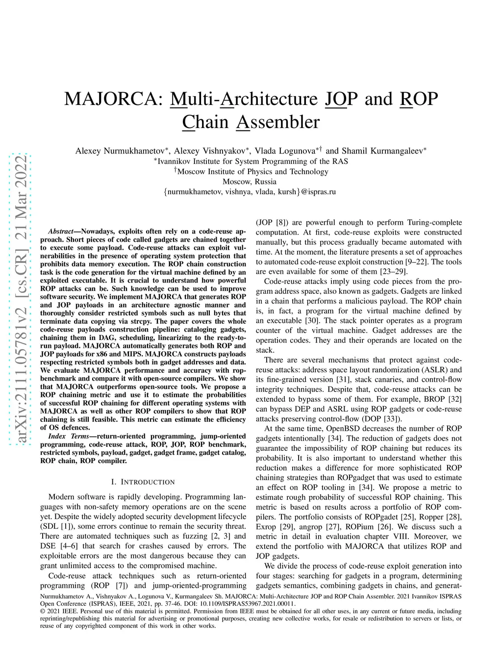 Nowadays, exploits often rely on a code-reuse approach. Short pieces of code called gadgets are chained together to execute some payload. Code-reuse attacks can exploit vulnerabilities in the presence of operating system protection that prohibits data memory execution. The ROP chain construction task is the code generation for the virtual machine defined by an exploited executable. It is crucial to understand how powerful ROP attacks can be. Such knowledge can be used to improve software security. We implement MAJORCA that generates ROP and JOP payloads in an architecture agnostic manner and thoroughly consider restricted symbols such as null bytes that terminate data copying via strcpy. The paper covers the whole code-reuse payloads construction pipeline: cataloging gadgets, chaining them in DAG, scheduling, linearizing to the ready-to-run payload. MAJORCA automatically generates both ROP and JOP payloads for x86 and MIPS. MAJORCA constructs payloads respecting restricted symbols both in gadget addresses and data. We evaluate MAJORCA performance and accuracy with rop-benchmark and compare it with open-source compilers. We show that MAJORCA outperforms open-source tools. We propose a ROP chaining metric and use it to estimate the probabilities of successful ROP chaining for different operating systems with MAJORCA as well as other ROP compilers to show that ROP chaining is still feasible. This metric can estimate the efficiency of OS defences.