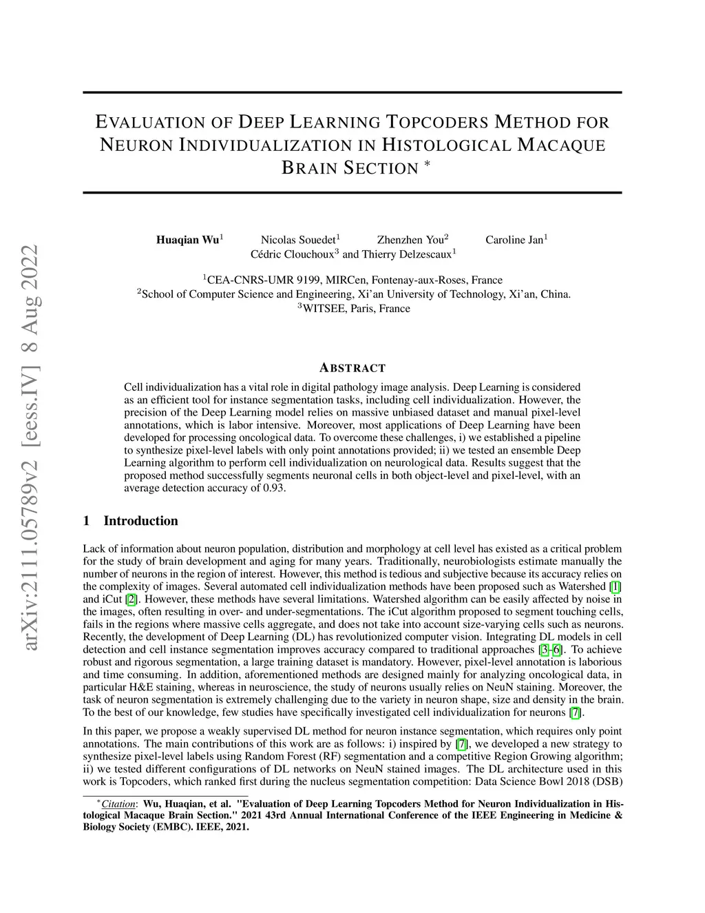 Cell individualization has a vital role in digital pathology image analysis. Deep Learning is considered as an efficient tool for instance segmentation tasks, including cell individualization. However, the precision of the Deep Learning model relies on massive unbiased dataset and manual pixel-level annotations, which is labor intensive. Moreover, most applications of Deep Learning have been developed for processing oncological data. To overcome these challenges, i) we established a pipeline to synthesize pixel-level labels with only point annotations provided; ii) we tested an ensemble Deep Learning algorithm to perform cell individualization on neurological data. Results suggest that the proposed method successfully segments neuronal cells in both object-level and pixel-level, with an average detection accuracy of 0.93.