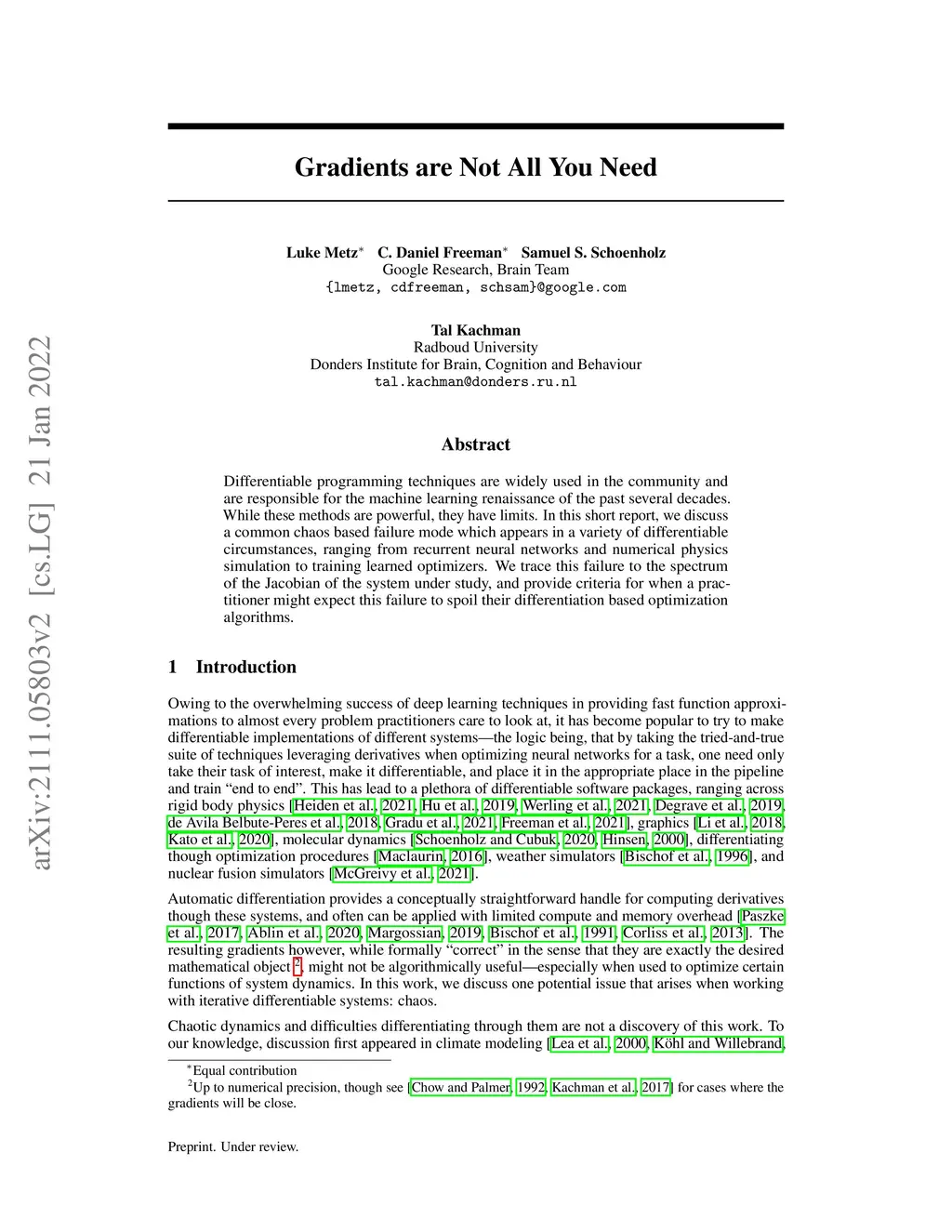 Differentiable programming techniques are widely used in the community and are responsible for the machine learning renaissance of the past several decades. While these methods are powerful, they have limits. In this short report, we discuss a common chaos based failure mode which appears in a variety of differentiable circumstances, ranging from recurrent neural networks and numerical physics simulation to training learned optimizers. We trace this failure to the spectrum of the Jacobian of the system under study, and provide criteria for when a practitioner might expect this failure to spoil their differentiation based optimization algorithms.