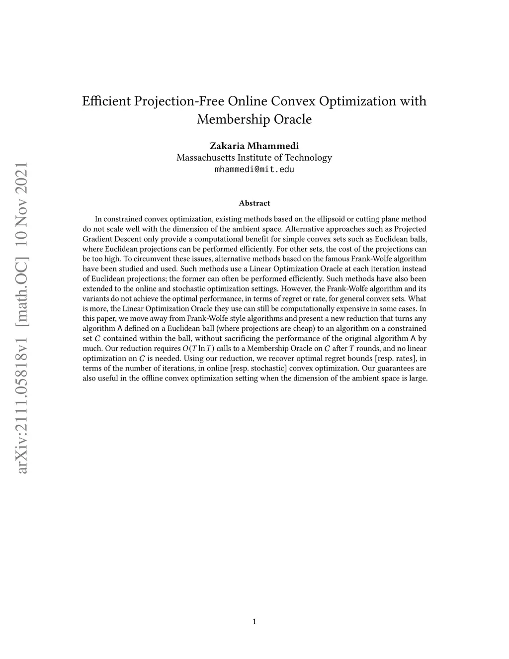 In constrained convex optimization, existing methods based on the ellipsoid or cutting plane method do not scale well with the dimension of the ambient space. Alternative approaches such as Projected Gradient Descent only provide a computational benefit for simple convex sets such as Euclidean balls, where Euclidean projections can be performed efficiently. For other sets, the cost of the projections can be too high. To circumvent these issues, alternative methods based on the famous Frank-Wolfe algorithm have been studied and used. Such methods use a Linear Optimization Oracle at each iteration instead of Euclidean projections; the former can often be performed efficiently. Such methods have also been extended to the online and stochastic optimization settings. However, the Frank-Wolfe algorithm and its variants do not achieve the optimal performance, in terms of regret or rate, for general convex sets. What is more, the Linear Optimization Oracle they use can still be computationally expensive in some cases. In this paper, we move away from Frank-Wolfe style algorithms and present a new reduction that turns any algorithm A defined on a Euclidean ball (where projections are cheap) to an algorithm on a constrained set C contained within the ball, without sacrificing the performance of the original algorithm A by much. Our reduction requires O(T log T) calls to a Membership Oracle on C after T rounds, and no linear optimization on C is needed. Using our reduction, we recover optimal regret bounds [resp. rates], in terms of the number of iterations, in online [resp. stochastic] convex optimization. Our guarantees are also useful in the offline convex optimization setting when the dimension of the ambient space is large.
