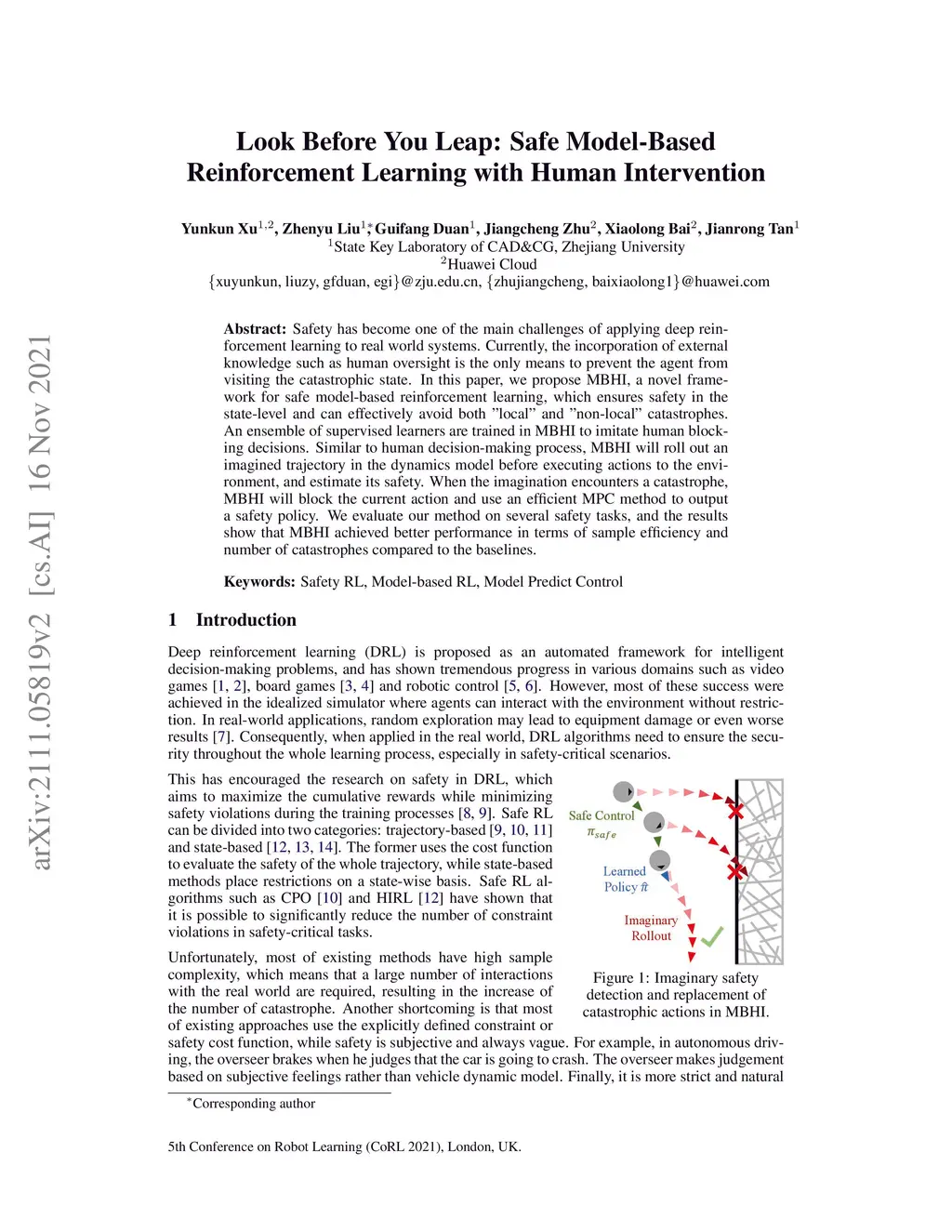 Safety has become one of the main challenges of applying deep reinforcement learning to real world systems. Currently, the incorporation of external knowledge such as human oversight is the only means to prevent the agent from visiting the catastrophic state. In this paper, we propose MBHI, a novel framework for safe model-based reinforcement learning, which ensures safety in the state-level and can effectively avoid both "local" and "non-local" catastrophes. An ensemble of supervised learners are trained in MBHI to imitate human blocking decisions. Similar to human decision-making process, MBHI will roll out an imagined trajectory in the dynamics model before executing actions to the environment, and estimate its safety. When the imagination encounters a catastrophe, MBHI will block the current action and use an efficient MPC method to output a safety policy. We evaluate our method on several safety tasks, and the results show that MBHI achieved better performance in terms of sample efficiency and number of catastrophes compared to the baselines.