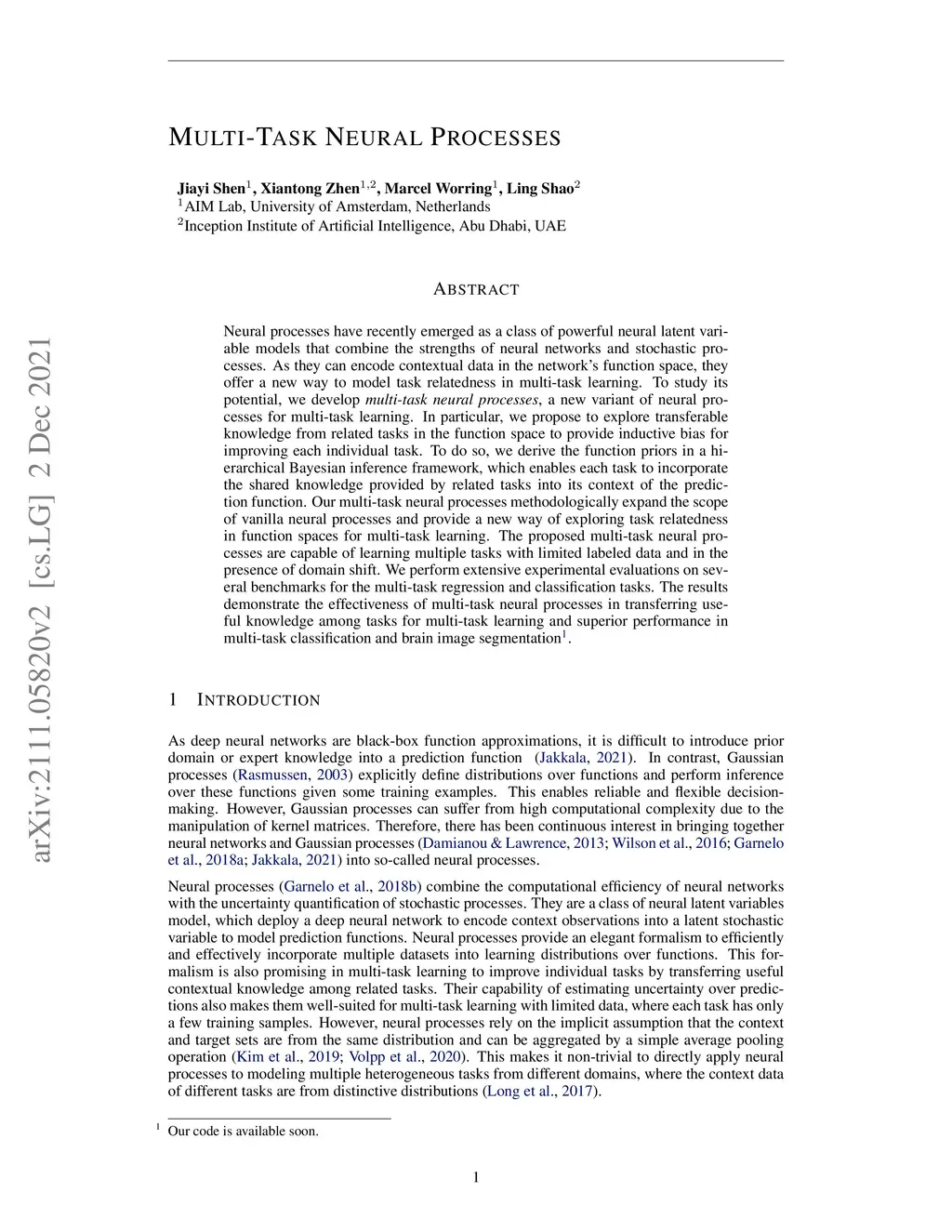 Neural processes have recently emerged as a class of powerful neural latent variable models that combine the strengths of neural networks and stochastic processes. As they can encode contextual data in the network's function space, they offer a new way to model task relatedness in multi-task learning. To study its potential, we develop multi-task neural processes, a new variant of neural processes for multi-task learning. In particular, we propose to explore transferable knowledge from related tasks in the function space to provide inductive bias for improving each individual task. To do so, we derive the function priors in a hierarchical Bayesian inference framework, which enables each task to incorporate the shared knowledge provided by related tasks into its context of the prediction function. Our multi-task neural processes methodologically expand the scope of vanilla neural processes and provide a new way of exploring task relatedness in function spaces for multi-task learning. The proposed multi-task neural processes are capable of learning multiple tasks with limited labeled data and in the presence of domain shift. We perform extensive experimental evaluations on several benchmarks for the multi-task regression and classification tasks. The results demonstrate the effectiveness of multi-task neural processes in transferring useful knowledge among tasks for multi-task learning and superior performance in multi-task classification and brain image segmentation.
