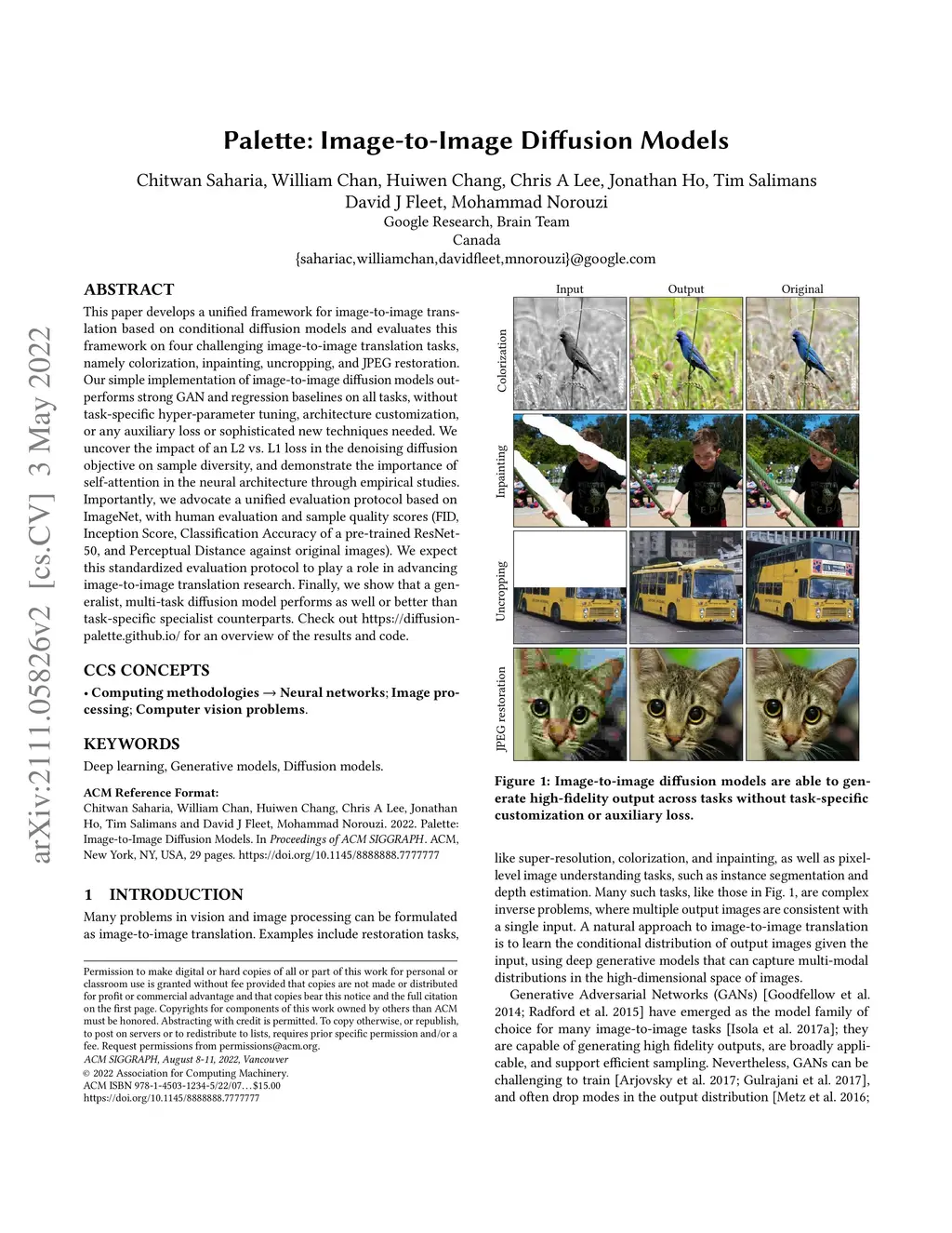 We introduce Palette, a simple and general framework for image-to-image translation using conditional diffusion models. On four challenging image-to-image translation tasks (colorization, inpainting, uncropping, and JPEG decompression), Palette outperforms strong GAN and regression baselines, and establishes a new state of the art. This is accomplished without task-specific hyper-parameter tuning, architecture customization, or any auxiliary loss, demonstrating a desirable degree of generality and flexibility. We uncover the impact of using vs. loss in the denoising diffusion objective on sample diversity, and demonstrate the importance of self-attention through empirical architecture studies. Importantly, we advocate a unified evaluation protocol based on ImageNet, and report several sample quality scores including FID, Inception Score, Classification Accuracy of a pre-trained ResNet-50, and Perceptual Distance against reference images for various baselines. We expect this standardized evaluation protocol to play a critical role in advancing image-to-image translation research. Finally, we show that a single generalist Palette model trained on 3 tasks (colorization, inpainting, JPEG decompression) performs as well or better than task-specific specialist counterparts.