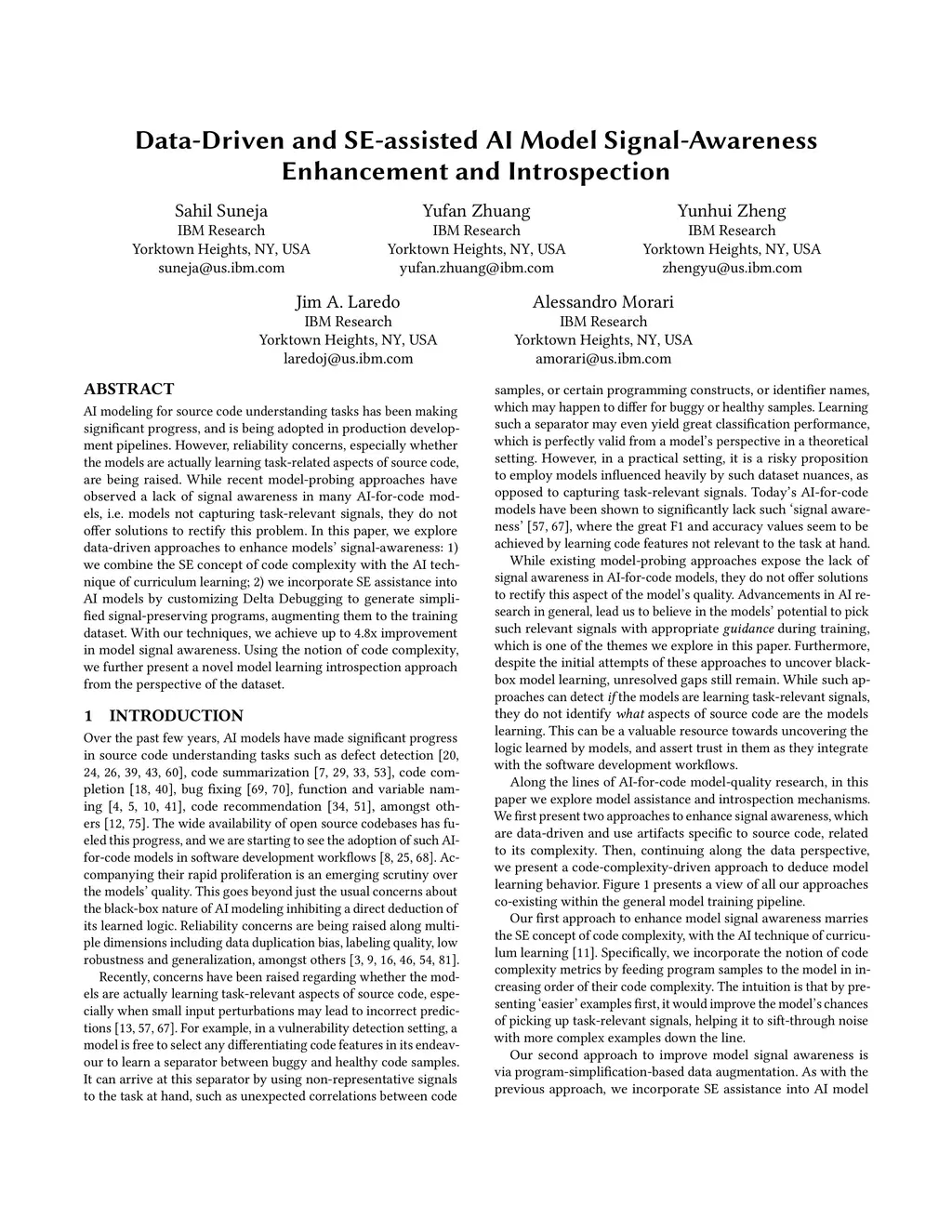 AI modeling for source code understanding tasks has been making significant progress, and is being adopted in production development pipelines. However, reliability concerns, especially whether the models are actually learning task-related aspects of source code, are being raised. While recent model-probing approaches have observed a lack of signal awareness in many AI-for-code models, i.e. models not capturing task-relevant signals, they do not offer solutions to rectify this problem. In this paper, we explore data-driven approaches to enhance models' signal-awareness: 1) we combine the SE concept of code complexity with the AI technique of curriculum learning; 2) we incorporate SE assistance into AI models by customizing Delta Debugging to generate simplified signal-preserving programs, augmenting them to the training dataset. With our techniques, we achieve up to 4.8x improvement in model signal awareness. Using the notion of code complexity, we further present a novel model learning introspection approach from the perspective of the dataset.