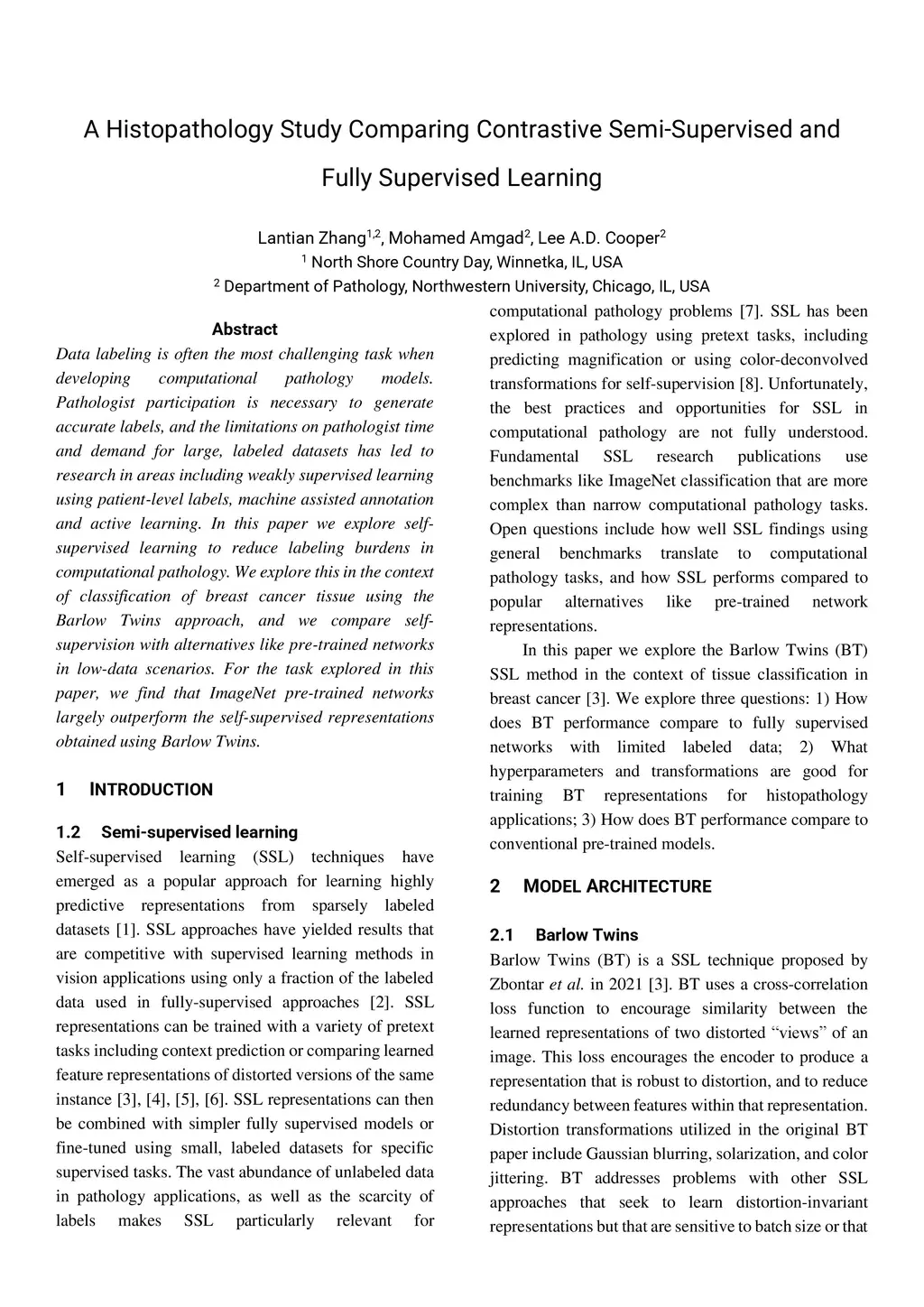 Data labeling is often the most challenging task when developing computational pathology models. Pathologist participation is necessary to generate accurate labels, and the limitations on pathologist time and demand for large, labeled datasets has led to research in areas including weakly supervised learning using patient-level labels, machine assisted annotation and active learning. In this paper we explore self-supervised learning to reduce labeling burdens in computational pathology. We explore this in the context of classification of breast cancer tissue using the Barlow Twins approach, and we compare self-supervision with alternatives like pre-trained networks in low-data scenarios. For the task explored in this paper, we find that ImageNet pre-trained networks largely outperform the self-supervised representations obtained using Barlow Twins.