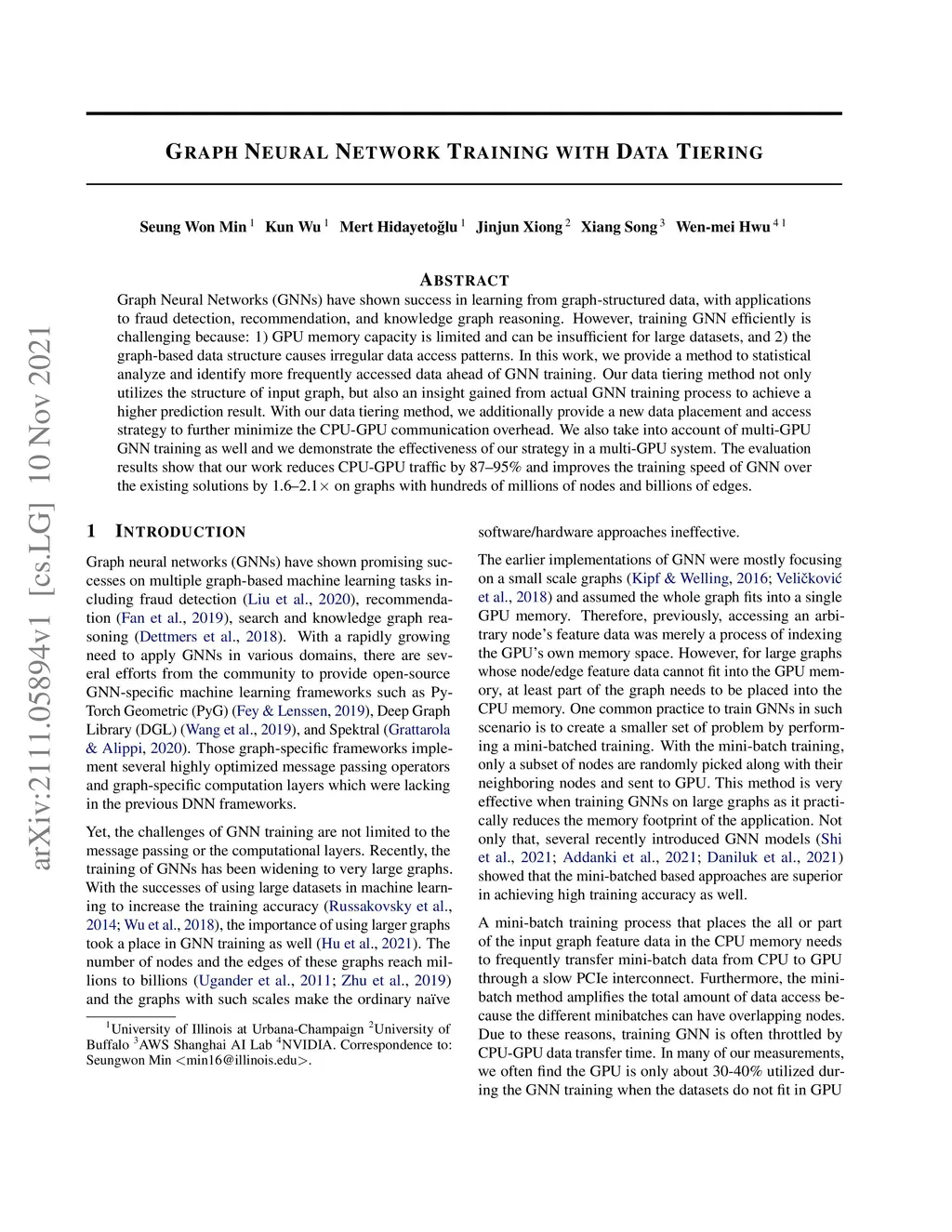 Graph Neural Networks (GNNs) have shown success in learning from graph-structured data, with applications to fraud detection, recommendation, and knowledge graph reasoning. However, training GNN efficiently is challenging because: 1) GPU memory capacity is limited and can be insufficient for large datasets, and 2) the graph-based data structure causes irregular data access patterns. In this work, we provide a method to statistical analyze and identify more frequently accessed data ahead of GNN training. Our data tiering method not only utilizes the structure of input graph, but also an insight gained from actual GNN training process to achieve a higher prediction result. With our data tiering method, we additionally provide a new data placement and access strategy to further minimize the CPU-GPU communication overhead. We also take into account of multi-GPU GNN training as well and we demonstrate the effectiveness of our strategy in a multi-GPU system. The evaluation results show that our work reduces CPU-GPU traffic by 87-95% and improves the training speed of GNN over the existing solutions by 1.6-2.1x on graphs with hundreds of millions of nodes and billions of edges.