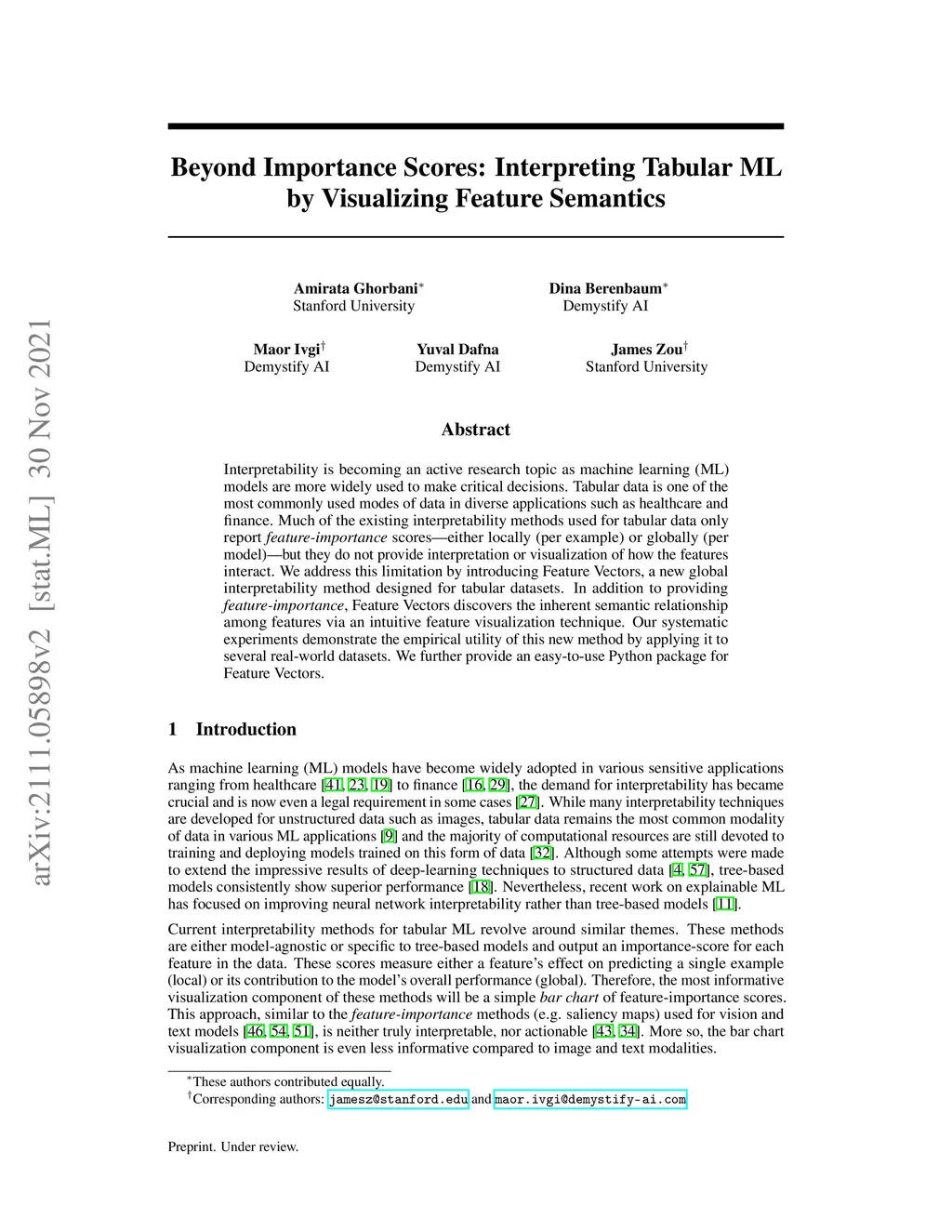 Interpretability is becoming an active research topic as machine learning (ML) models are more widely used to make critical decisions. Tabular data is one of the most commonly used modes of data in diverse applications such as healthcare and finance. Much of the existing interpretability methods used for tabular data only report feature-importance scores -- either locally (per example) or globally (per model) -- but they do not provide interpretation or visualization of how the features interact. We address this limitation by introducing Feature Vectors, a new global interpretability method designed for tabular datasets. In addition to providing feature-importance, Feature Vectors discovers the inherent semantic relationship among features via an intuitive feature visualization technique. Our systematic experiments demonstrate the empirical utility of this new method by applying it to several real-world datasets. We further provide an easy-to-use Python package for Feature Vectors.