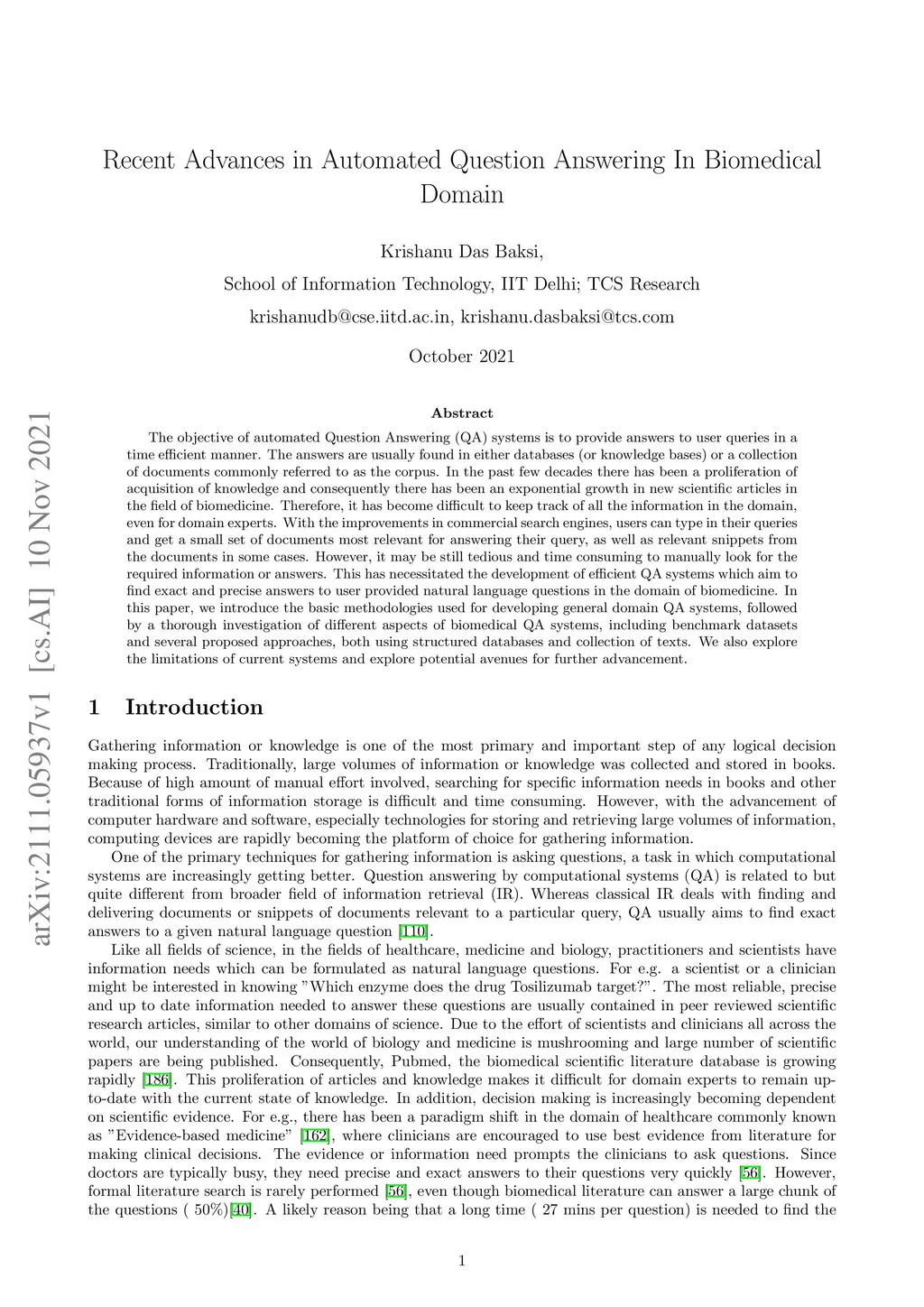 The objective of automated Question Answering (QA) systems is to provide answers to user queries in a time efficient manner. The answers are usually found in either databases (or knowledge bases) or a collection of documents commonly referred to as the corpus. In the past few decades there has been a proliferation of acquisition of knowledge and consequently there has been an exponential growth in new scientific articles in the field of biomedicine. Therefore, it has become difficult to keep track of all the information in the domain, even for domain experts. With the improvements in commercial search engines, users can type in their queries and get a small set of documents most relevant for answering their query, as well as relevant snippets from the documents in some cases. However, it may be still tedious and time consuming to manually look for the required information or answers. This has necessitated the development of efficient QA systems which aim to find exact and precise answers to user provided natural language questions in the domain of biomedicine. In this paper, we introduce the basic methodologies used for developing general domain QA systems, followed by a thorough investigation of different aspects of biomedical QA systems, including benchmark datasets and several proposed approaches, both using structured databases and collection of texts. We also explore the limitations of current systems and explore potential avenues for further advancement.