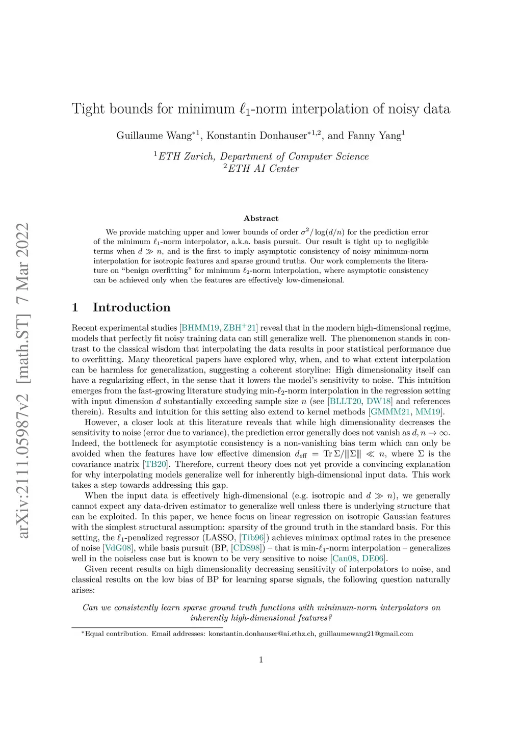 We provide matching upper and lower bounds of order for the prediction error of the minimum -norm interpolator, a.k.a. basis pursuit. Our result is tight up to negligible terms when , and is the first to imply asymptotic consistency of noisy minimum-norm interpolation for isotropic features and sparse ground truths. Our work complements the literature on "benign overfitting" for minimum -norm interpolation, where asymptotic consistency can be achieved only when the features are effectively low-dimensional.