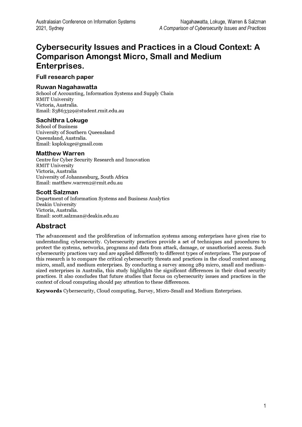 The advancement and the proliferation of information systems among enterprises have given rise to understanding cybersecurity. Cybersecurity practices provide a set of techniques and procedures to protect the systems, networks, programs and data from attack, damage, or unauthorised access. Such cybersecurity practices vary and are applied differently to different types of enterprises. The purpose of this research is to compare the critical cybersecurity threats and practices in the cloud context among micro, small, and medium enterprises. By conducting a survey among 289 micro, small and medium-sized enterprises in Australia, this study highlights the significant differences in their cloud security practices. It also concludes that future studies that focus on cybersecurity issues and practices in the context of cloud computing should pay attention to these differences.