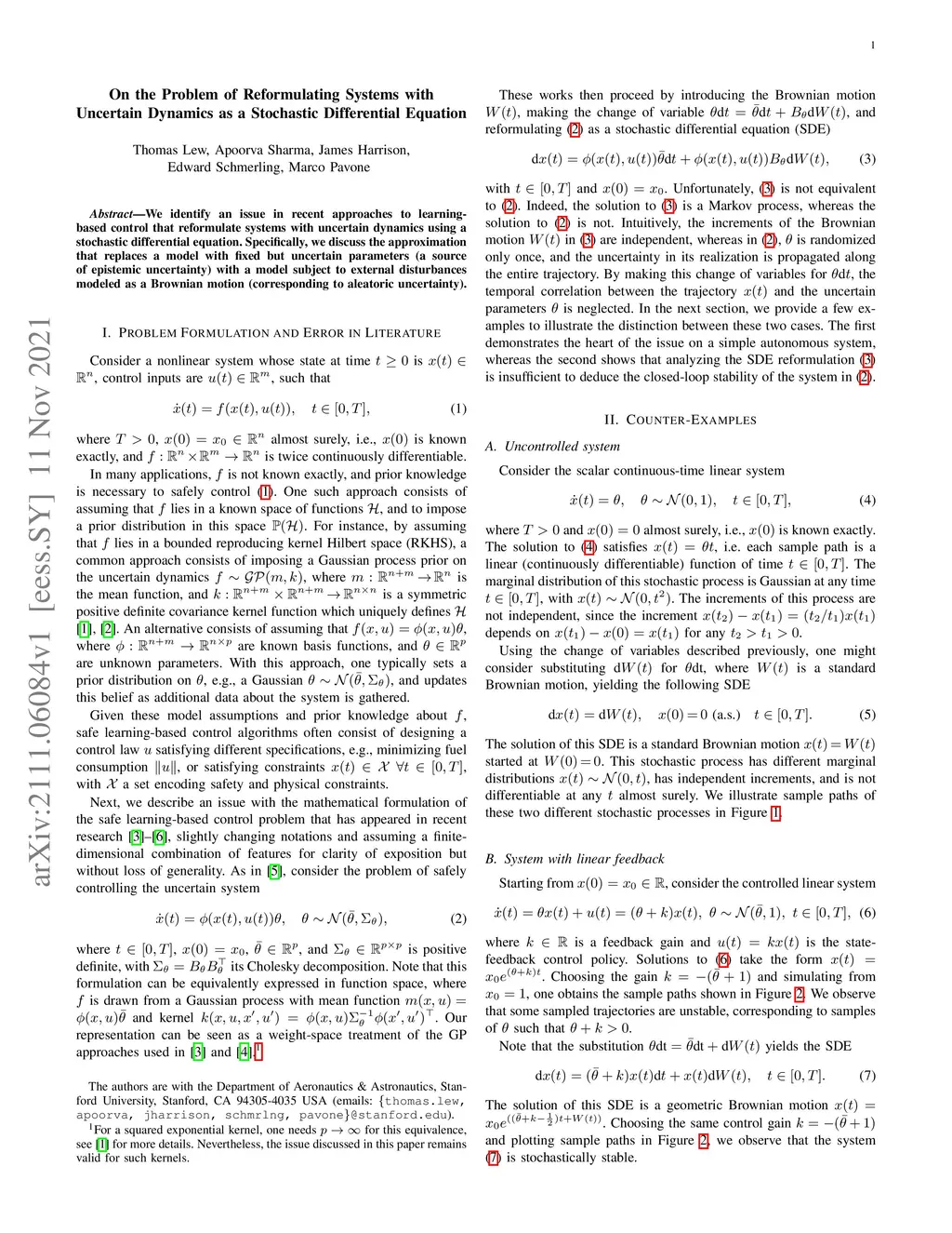 We identify an issue in recent approaches to learning-based control that reformulate systems with uncertain dynamics using a stochastic differential equation. Specifically, we discuss the approximation that replaces a model with fixed but uncertain parameters (a source of epistemic uncertainty) with a model subject to external disturbances modeled as a Brownian motion (corresponding to aleatoric uncertainty).