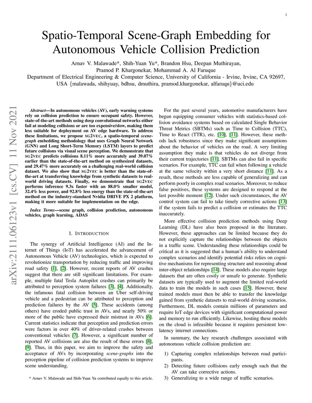 In autonomous vehicles (AVs), early warning systems rely on collision prediction to ensure occupant safety. However, state-of-the-art methods using deep convolutional networks either fail at modeling collisions or are too expensive/slow, making them less suitable for deployment on AV edge hardware. To address these limitations, we propose sg2vec, a spatio-temporal scene-graph embedding methodology that uses Graph Neural Network (GNN) and Long Short-Term Memory (LSTM) layers to predict future collisions via visual scene perception. We demonstrate that sg2vec predicts collisions 8.11% more accurately and 39.07% earlier than the state-of-the-art method on synthesized datasets, and 29.47% more accurately on a challenging real-world collision dataset. We also show that sg2vec is better than the state-of-the-art at transferring knowledge from synthetic datasets to real-world driving datasets. Finally, we demonstrate that sg2vec performs inference 9.3x faster with an 88.0% smaller model, 32.4% less power, and 92.8% less energy than the state-of-the-art method on the industry-standard Nvidia DRIVE PX 2 platform, making it more suitable for implementation on the edge.