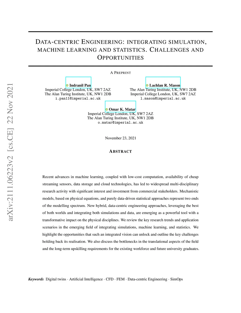 Recent advances in machine learning, coupled with low-cost computation, availability of cheap streaming sensors, data storage and cloud technologies, has led to widespread multi-disciplinary research activity with significant interest and investment from commercial stakeholders. Mechanistic models, based on physical equations, and purely data-driven statistical approaches represent two ends of the modelling spectrum. New hybrid, data-centric engineering approaches, leveraging the best of both worlds and integrating both simulations and data, are emerging as a powerful tool with a transformative impact on the physical disciplines. We review the key research trends and application scenarios in the emerging field of integrating simulations, machine learning, and statistics. We highlight the opportunities that such an integrated vision can unlock and outline the key challenges holding back its realisation. We also discuss the bottlenecks in the translational aspects of the field and the long-term upskilling requirements of the existing workforce and future university graduates.