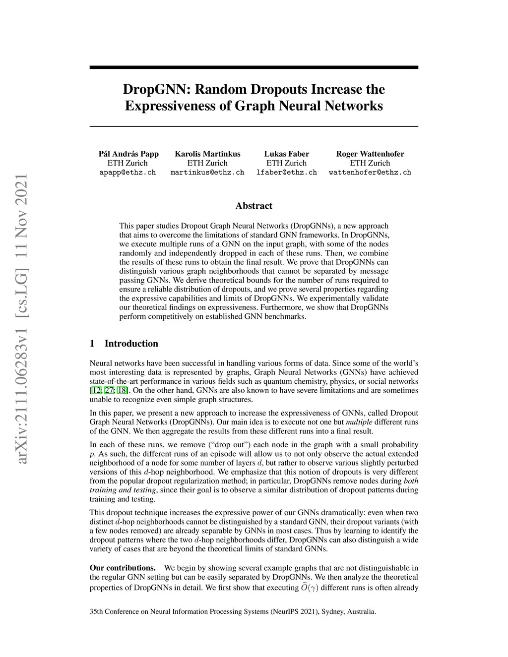 This paper studies Dropout Graph Neural Networks (DropGNNs), a new approach that aims to overcome the limitations of standard GNN frameworks. In DropGNNs, we execute multiple runs of a GNN on the input graph, with some of the nodes randomly and independently dropped in each of these runs. Then, we combine the results of these runs to obtain the final result. We prove that DropGNNs can distinguish various graph neighborhoods that cannot be separated by message passing GNNs. We derive theoretical bounds for the number of runs required to ensure a reliable distribution of dropouts, and we prove several properties regarding the expressive capabilities and limits of DropGNNs. We experimentally validate our theoretical findings on expressiveness. Furthermore, we show that DropGNNs perform competitively on established GNN benchmarks.