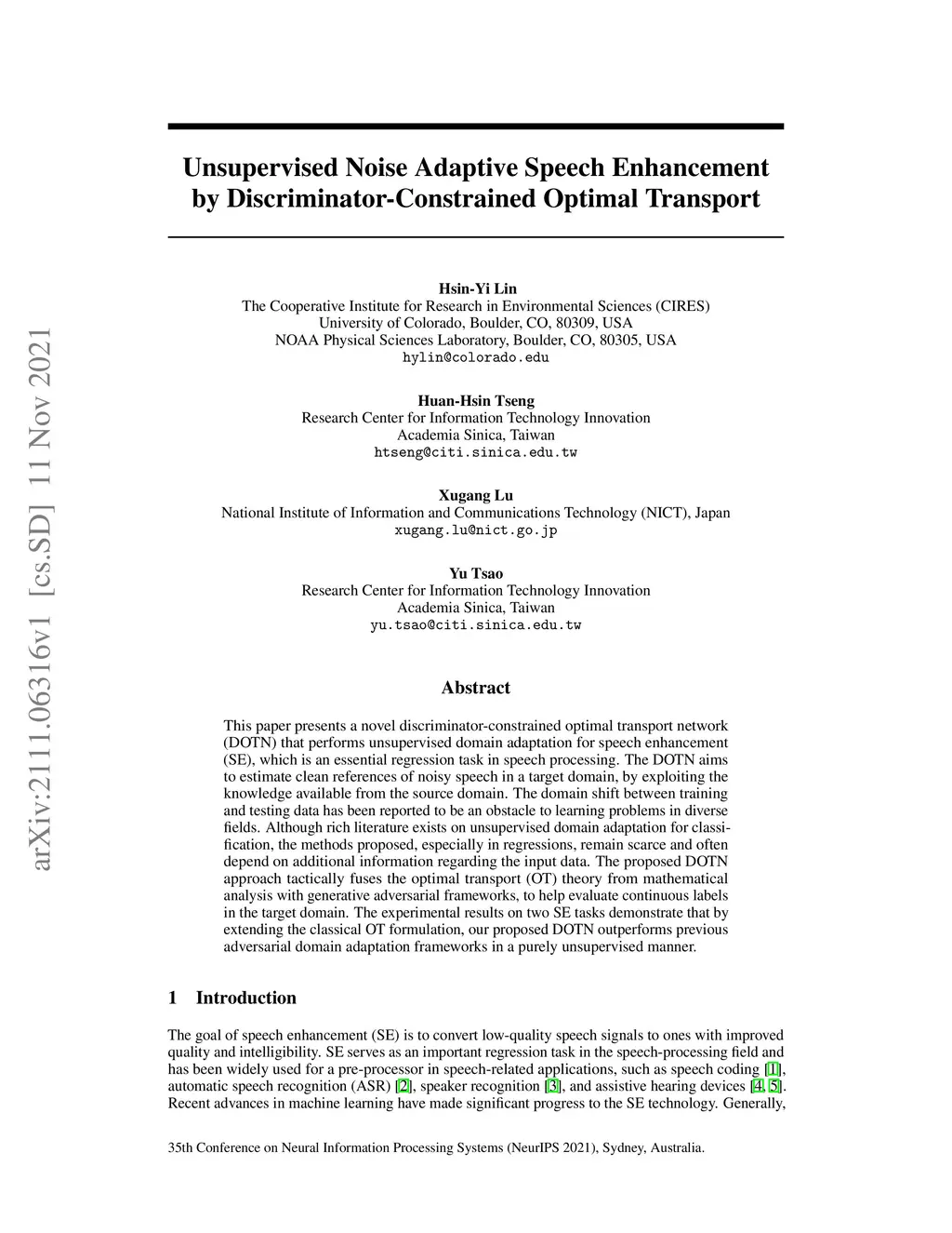 This paper presents a novel discriminator-constrained optimal transport network (DOTN) that performs unsupervised domain adaptation for speech enhancement (SE), which is an essential regression task in speech processing. The DOTN aims to estimate clean references of noisy speech in a target domain, by exploiting the knowledge available from the source domain. The domain shift between training and testing data has been reported to be an obstacle to learning problems in diverse fields. Although rich literature exists on unsupervised domain adaptation for classification, the methods proposed, especially in regressions, remain scarce and often depend on additional information regarding the input data. The proposed DOTN approach tactically fuses the optimal transport (OT) theory from mathematical analysis with generative adversarial frameworks, to help evaluate continuous labels in the target domain. The experimental results on two SE tasks demonstrate that by extending the classical OT formulation, our proposed DOTN outperforms previous adversarial domain adaptation frameworks in a purely unsupervised manner.