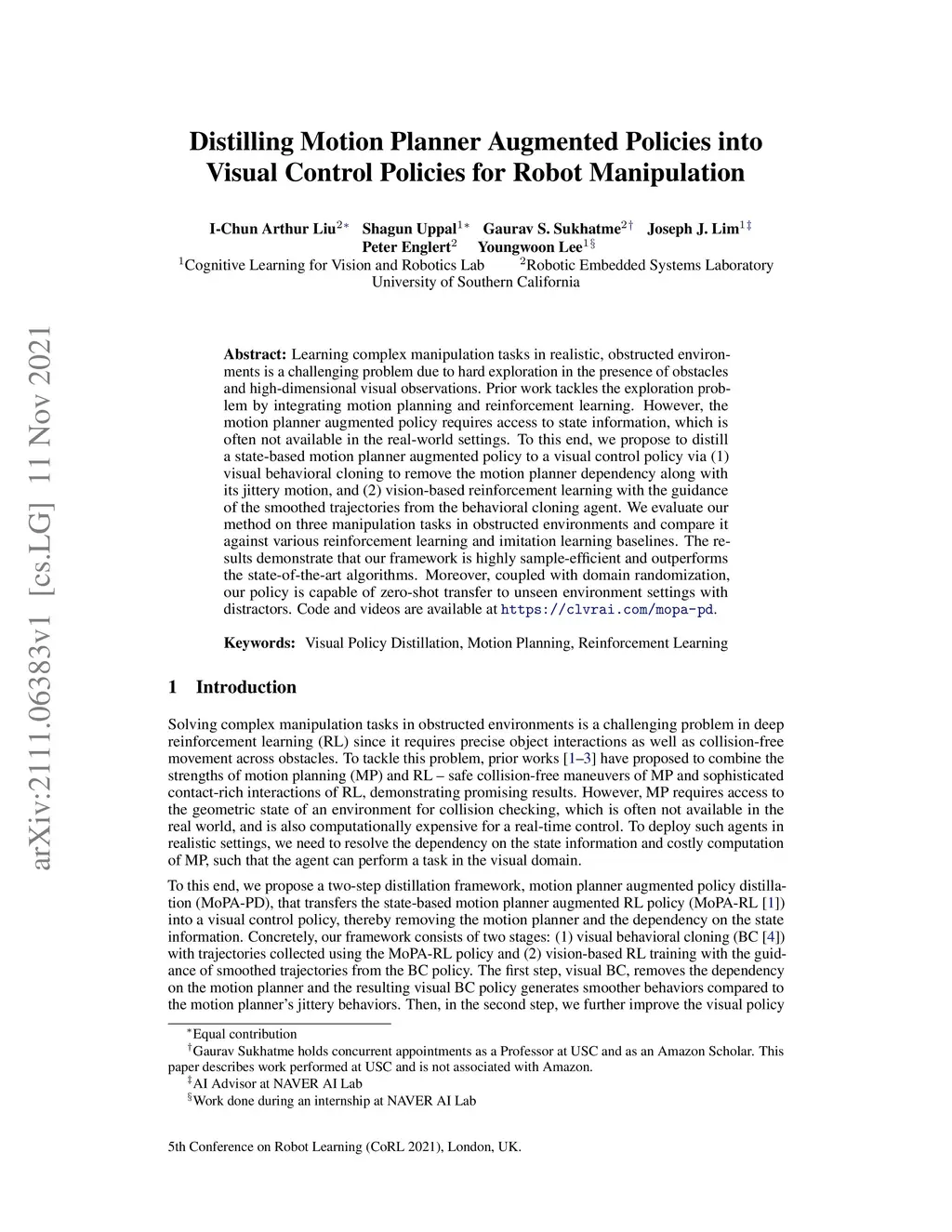 Learning complex manipulation tasks in realistic, obstructed environments is a challenging problem due to hard exploration in the presence of obstacles and high-dimensional visual observations. Prior work tackles the exploration problem by integrating motion planning and reinforcement learning. However, the motion planner augmented policy requires access to state information, which is often not available in the real-world settings. To this end, we propose to distill a state-based motion planner augmented policy to a visual control policy via (1) visual behavioral cloning to remove the motion planner dependency along with its jittery motion, and (2) vision-based reinforcement learning with the guidance of the smoothed trajectories from the behavioral cloning agent. We evaluate our method on three manipulation tasks in obstructed environments and compare it against various reinforcement learning and imitation learning baselines. The results demonstrate that our framework is highly sample-efficient and outperforms the state-of-the-art algorithms. Moreover, coupled with domain randomization, our policy is capable of zero-shot transfer to unseen environment settings with distractors. Code and videos are available at https://clvrai.com/mopa-pd