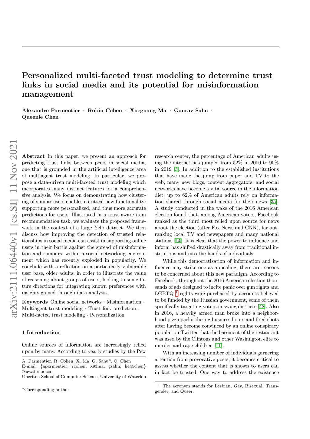 In this paper, we present an approach for predicting trust links between peers in social media, one that is grounded in the artificial intelligence area of multiagent trust modeling. In particular, we propose a data-driven multi-faceted trust modeling which incorporates many distinct features for a comprehensive analysis. We focus on demonstrating how clustering of similar users enables a critical new functionality: supporting more personalized, and thus more accurate predictions for users. Illustrated in a trust-aware item recommendation task, we evaluate the proposed framework in the context of a large Yelp dataset. We then discuss how improving the detection of trusted relationships in social media can assist in supporting online users in their battle against the spread of misinformation and rumours, within a social networking environment which has recently exploded in popularity. We conclude with a reflection on a particularly vulnerable user base, older adults, in order to illustrate the value of reasoning about groups of users, looking to some future directions for integrating known preferences with insights gained through data analysis.