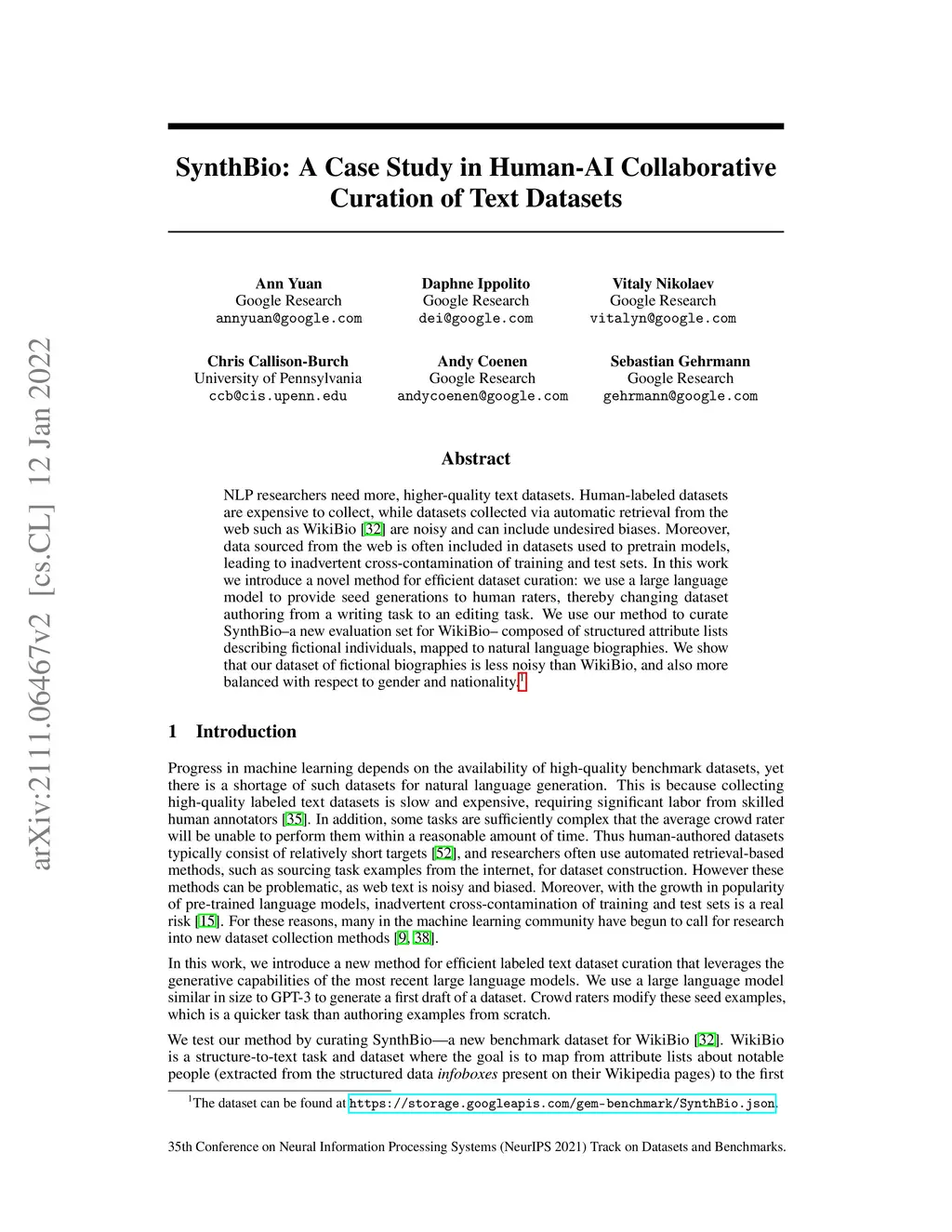 NLP researchers need more, higher-quality text datasets. Human-labeled datasets are expensive to collect, while datasets collected via automatic retrieval from the web such as WikiBio are noisy and can include undesired biases. Moreover, data sourced from the web is often included in datasets used to pretrain models, leading to inadvertent cross-contamination of training and test sets. In this work we introduce a novel method for efficient dataset curation: we use a large language model to provide seed generations to human raters, thereby changing dataset authoring from a writing task to an editing task. We use our method to curate SynthBio - a new evaluation set for WikiBio - composed of structured attribute lists describing fictional individuals, mapped to natural language biographies. We show that our dataset of fictional biographies is less noisy than WikiBio, and also more balanced with respect to gender and nationality.