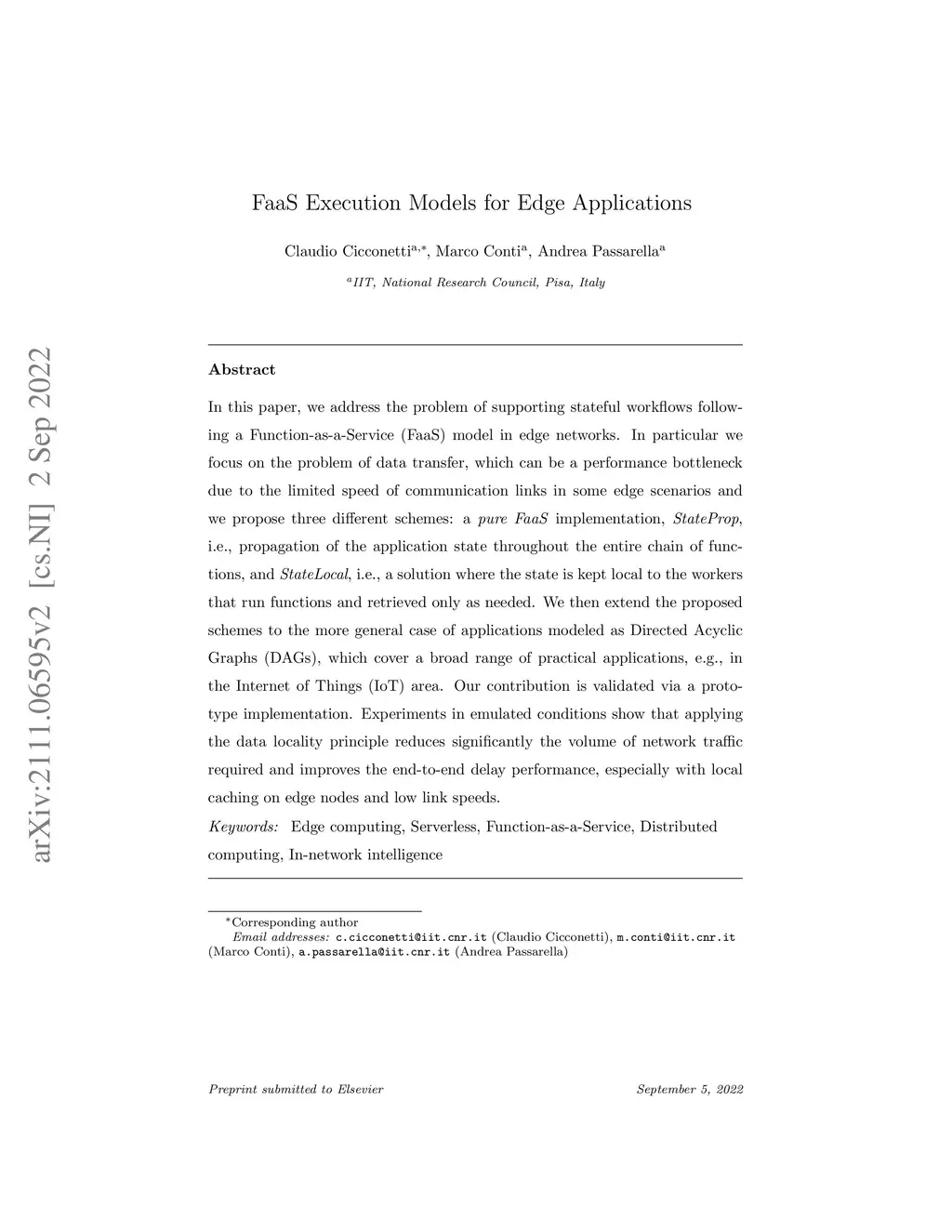 In this paper, we address the problem of supporting stateful workflows following a Function-as-a-Service (FaaS) model in edge networks. In particular we focus on the problem of data transfer, which can be a performance bottleneck due to the limited speed of communication links in some edge scenarios and we propose three different schemes: a pure FaaS implementation, StateProp, i.e., propagation of the application state throughout the entire chain of functions, and StateLocal, i.e., a solution where the state is kept local to the workers that run functions and retrieved only as needed. We then extend the proposed schemes to the more general case of applications modeled as Directed Acyclic Graphs (DAGs), which cover a broad range of practical applications, e.g., in the Internet of Things (IoT) area. Our contribution is validated via a prototype implementation. Experiments in emulated conditions show that applying the data locality principle reduces significantly the volume of network traffic required and improves the end-to-end delay performance, especially with local caching on edge nodes and low link speeds.