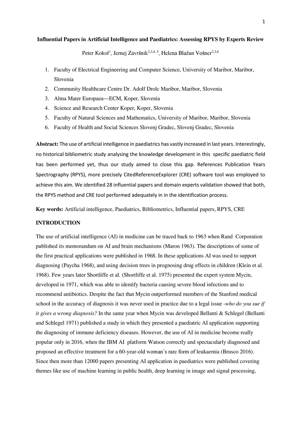 Influential Papers in Artificial Intelligence and Paediatrics: Assessing