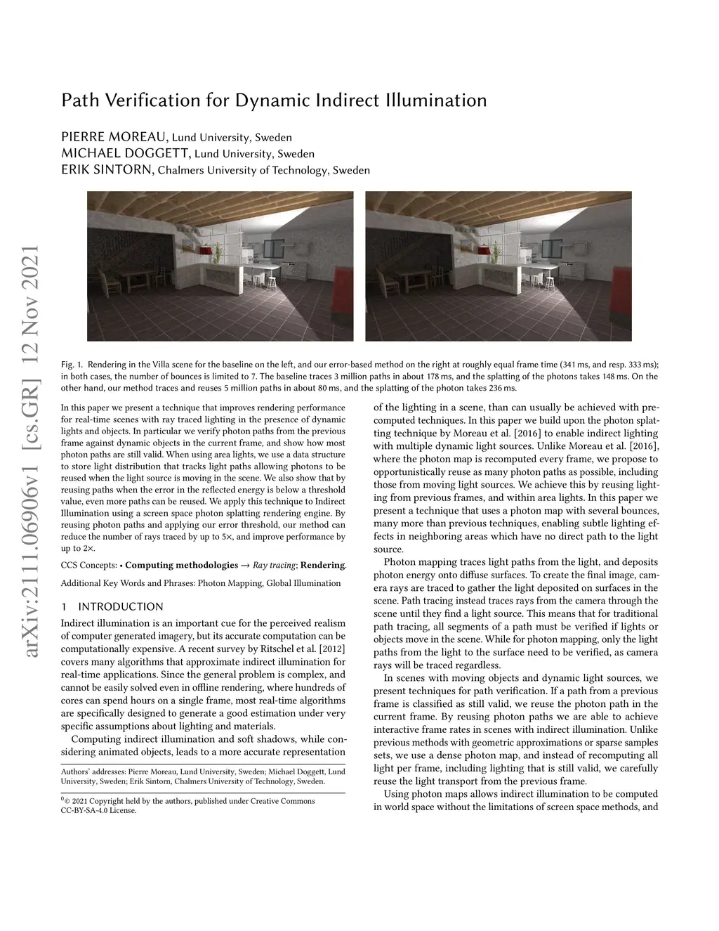 In this paper we present a technique that improves rendering performance for real-time scenes with ray traced lighting in the presence of dynamic lights and objects. In particular we verify photon paths from the previous frame against dynamic objects in the current frame, and show how most photon paths are still valid. When using area lights, we use a data structure to store light distribution that tracks light paths allowing photons to be reused when the light source is moving in the scene. We also show that by reusing paths when the error in the reflected energy is below a threshold value, even more paths can be reused. We apply this technique to Indirect Illumination using a screen space photon splatting rendering engine. By reusing photon paths and applying our error threshold, our method can reduce the number of rays traced by up to 5x, and improve performance by up to 2x.
