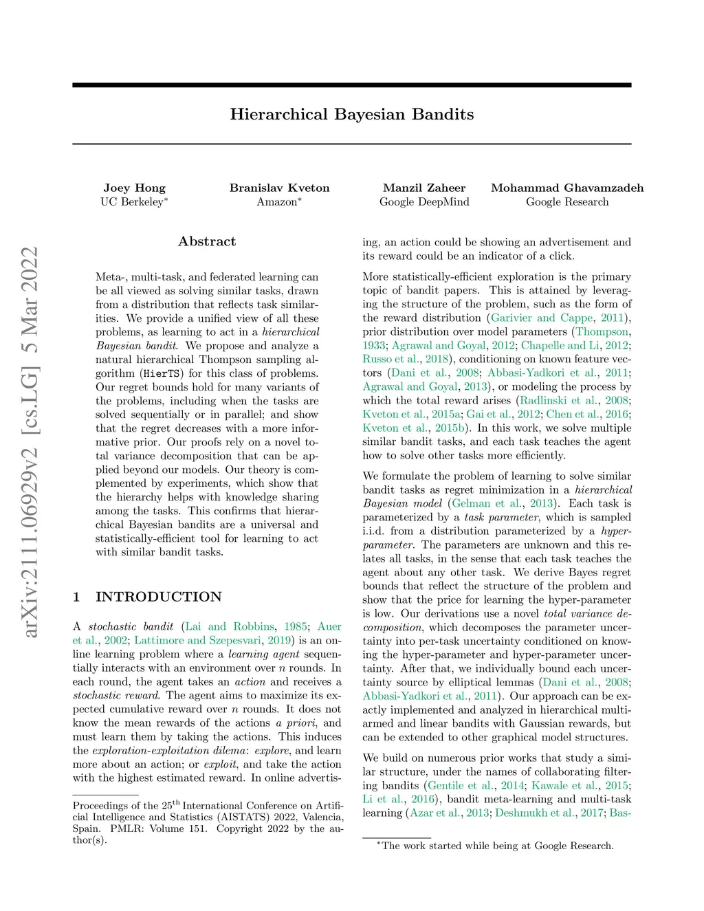Meta-, multi-task, and federated learning can be all viewed as solving similar tasks, drawn from a distribution that reflects task similarities. We provide a unified view of all these problems, as learning to act in a hierarchical Bayesian bandit. We propose and analyze a natural hierarchical Thompson sampling algorithm (HierTS) for this class of problems. Our regret bounds hold for many variants of the problems, including when the tasks are solved sequentially or in parallel; and show that the regret decreases with a more informative prior. Our proofs rely on a novel total variance decomposition that can be applied beyond our models. Our theory is complemented by experiments, which show that the hierarchy helps with knowledge sharing among the tasks. This confirms that hierarchical Bayesian bandits are a universal and statistically-efficient tool for learning to act with similar bandit tasks.