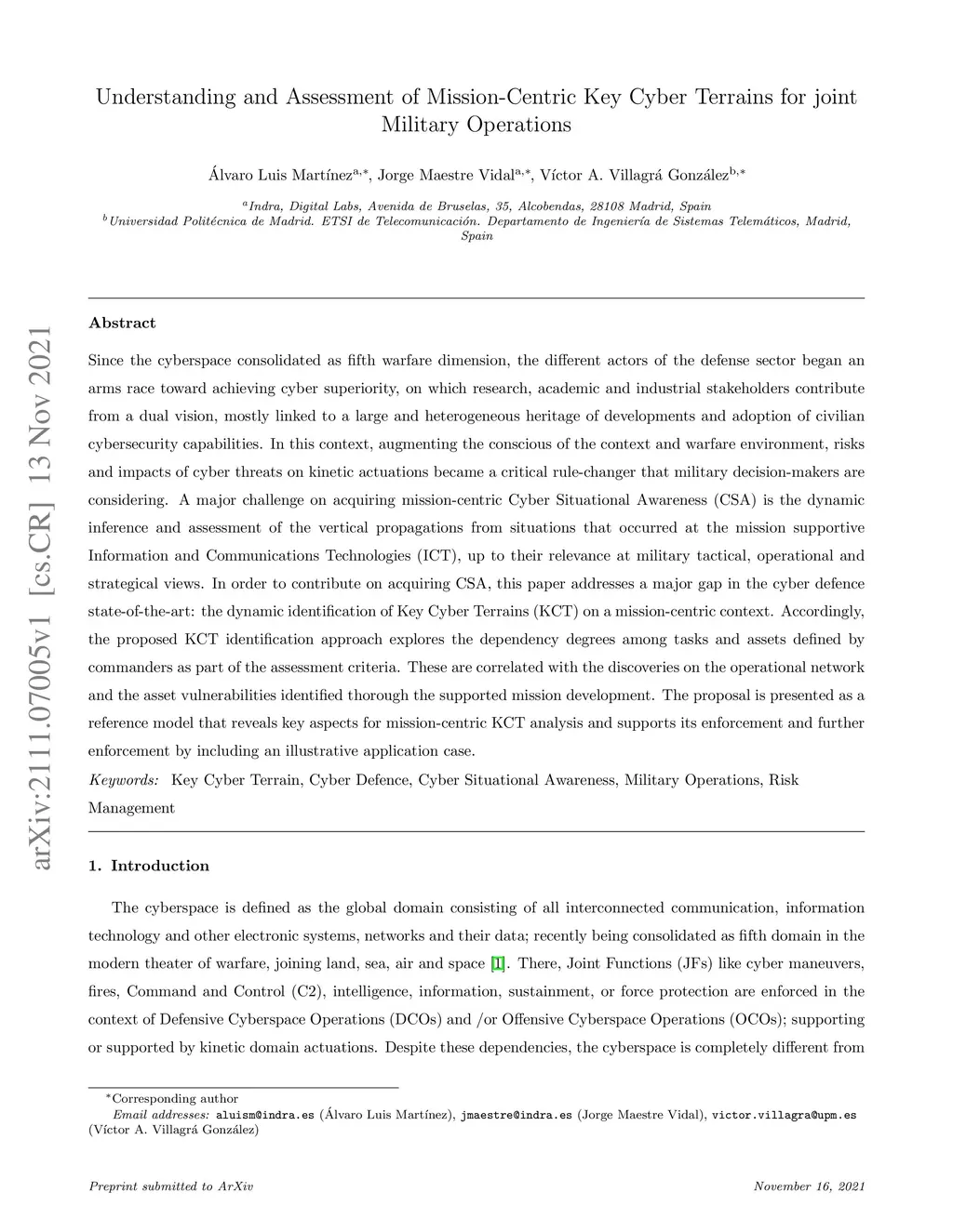 Since the cyberspace consolidated as fifth warfare dimension, the different actors of the defense sector began an arms race toward achieving cyber superiority, on which research, academic and industrial stakeholders contribute from a dual vision, mostly linked to a large and heterogeneous heritage of developments and adoption of civilian cybersecurity capabilities. In this context, augmenting the conscious of the context and warfare environment, risks and impacts of cyber threats on kinetic actuations became a critical rule-changer that military decision-makers are considering. A major challenge on acquiring mission-centric Cyber Situational Awareness (CSA) is the dynamic inference and assessment of the vertical propagations from situations that occurred at the mission supportive Information and Communications Technologies (ICT), up to their relevance at military tactical, operational and strategical views. In order to contribute on acquiring CSA, this paper addresses a major gap in the cyber defence state-of-the-art: the dynamic identification of Key Cyber Terrains (KCT) on a mission-centric context. Accordingly, the proposed KCT identification approach explores the dependency degrees among tasks and assets defined by commanders as part of the assessment criteria. These are correlated with the discoveries on the operational network and the asset vulnerabilities identified thorough the supported mission development. The proposal is presented as a reference model that reveals key aspects for mission-centric KCT analysis and supports its enforcement and further enforcement by including an illustrative application case.