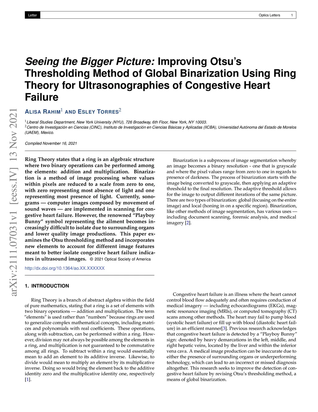 Ring Theory states that a ring is an algebraic structure where two binary operations can be performed among the elements addition and multiplication. Binarization is a method of image processing where values within pixels are reduced to a scale from zero to one, with zero representing the most absence of light and one representing the most presence of light. Currently, sonograms are implemented in scanning for congestive heart failure. However, the renowned Playboy Bunny symbol representing the ailment becomes increasingly difficult to isolate due to surrounding organs and lower quality image productions. This paper examines the Otsu thresholding method and incorporates new elements to account for different image features meant to better isolate congestive heart failure indicators in ultrasound images.