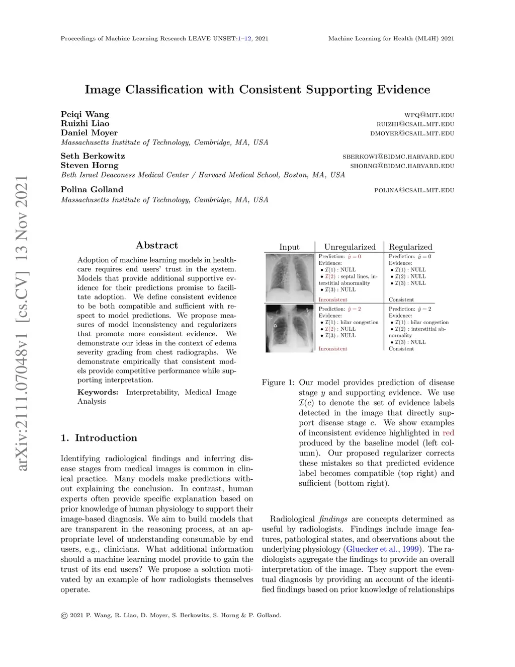 Adoption of machine learning models in healthcare requires end users' trust in the system. Models that provide additional supportive evidence for their predictions promise to facilitate adoption. We define consistent evidence to be both compatible and sufficient with respect to model predictions. We propose measures of model inconsistency and regularizers that promote more consistent evidence. We demonstrate our ideas in the context of edema severity grading from chest radiographs. We demonstrate empirically that consistent models provide competitive performance while supporting interpretation.