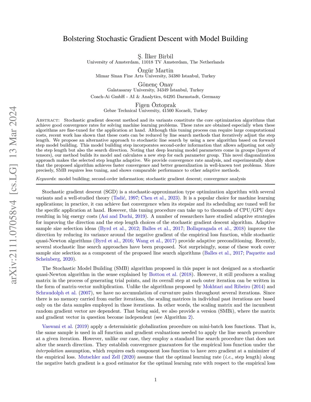 Stochastic gradient descent method and its variants constitute the core optimization algorithms that achieve good convergence rates for solving machine learning problems. These rates are obtained especially when these algorithms are fine-tuned for the application at hand. Although this tuning process can require large computational costs, recent work has shown that these costs can be reduced by line search methods that iteratively adjust the step length. We propose an alternative approach to stochastic line search by using a new algorithm based on forward step model building. This model building step incorporates second-order information that allows adjusting not only the step length but also the search direction. Noting that deep learning model parameters come in groups (layers of tensors), our method builds its model and calculates a new step for each parameter group. This novel diagonalization approach makes the selected step lengths adaptive. We provide convergence rate analysis, and experimentally show that the proposed algorithm achieves faster convergence and better generalization in well-known test problems. More precisely, SMB requires less tuning, and shows comparable performance to other adaptive methods.