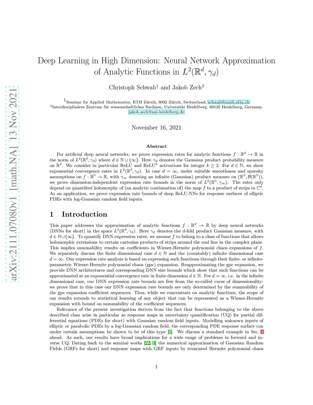 For artificial deep neural networks, we prove expression rates for analytic functions in the norm of where . Here denotes the Gaussian product probability measure on . We consider in particular ReLU and ReLU activations for integer . For , we show exponential convergence rates in . In case , under suitable smoothness and sparsity assumptions on , with denoting an infinite (Gaussian) product measure on , we prove dimension-independent expression rate bounds in the norm of . The rates only depend on quantified holomorphy of (an analytic continuation of) the map to a product of strips in . As an application, we prove expression rate bounds of deep ReLU-NNs for response surfaces of elliptic PDEs with log-Gaussian random field inputs.
