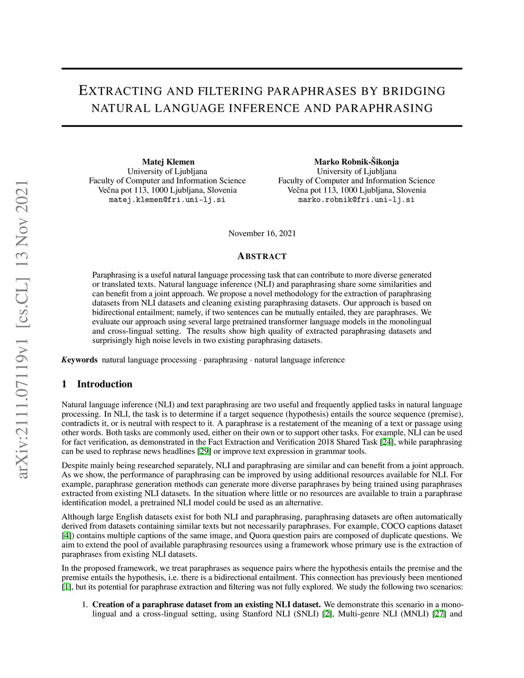 Paraphrasing is a useful natural language processing task that can contribute to more diverse generated or translated texts. Natural language inference (NLI) and paraphrasing share some similarities and can benefit from a joint approach. We propose a novel methodology for the extraction of paraphrasing datasets from NLI datasets and cleaning existing paraphrasing datasets. Our approach is based on bidirectional entailment; namely, if two sentences can be mutually entailed, they are paraphrases. We evaluate our approach using several large pretrained transformer language models in the monolingual and cross-lingual setting. The results show high quality of extracted paraphrasing datasets and surprisingly high noise levels in two existing paraphrasing datasets.