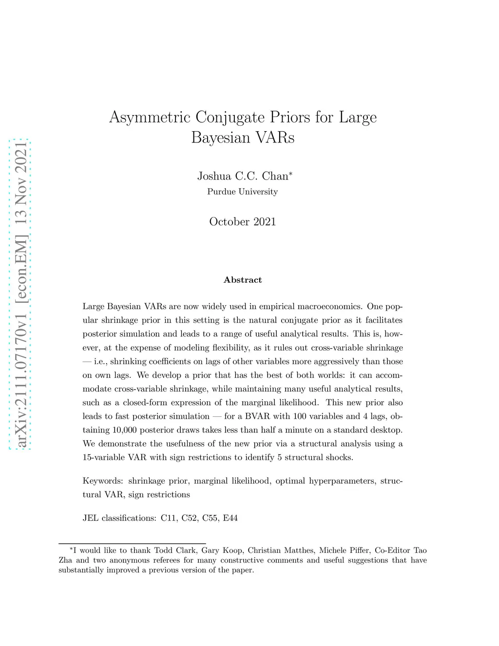 Large Bayesian VARs are now widely used in empirical macroeconomics. One popular shrinkage prior in this setting is the natural conjugate prior as it facilitates posterior simulation and leads to a range of useful analytical results. This is, however, at the expense of modeling flexibility, as it rules out cross-variable shrinkage -- i.e., shrinking coefficients on lags of other variables more aggressively than those on own lags. We develop a prior that has the best of both worlds: it can accommodate cross-variable shrinkage, while maintaining many useful analytical results, such as a closed-form expression of the marginal likelihood. This new prior also leads to fast posterior simulation -- for a BVAR with 100 variables and 4 lags, obtaining 10,000 posterior draws takes less than half a minute on a standard desktop. We demonstrate the usefulness of the new prior via a structural analysis using a 15-variable VAR with sign restrictions to identify 5 structural shocks.