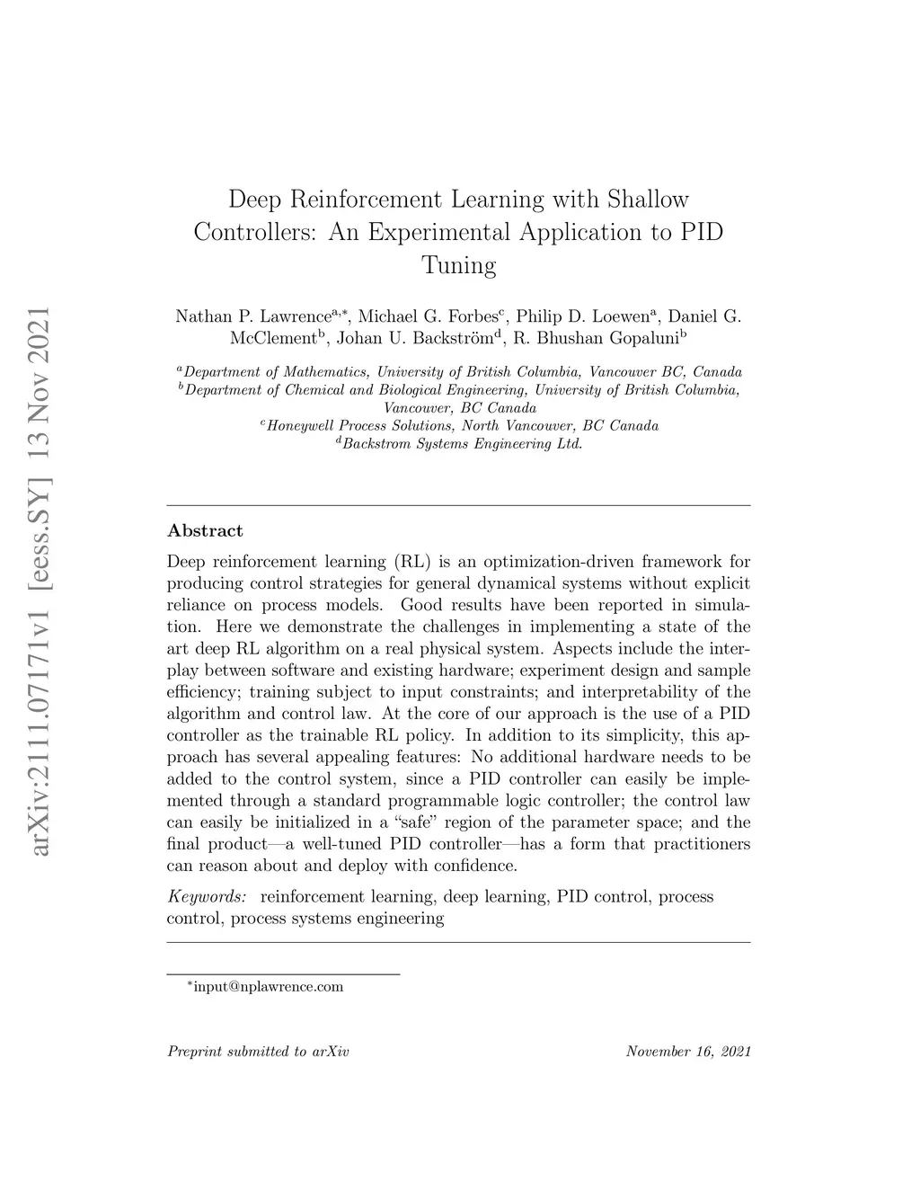 Deep reinforcement learning (RL) is an optimization-driven framework for producing control strategies for general dynamical systems without explicit reliance on process models. Good results have been reported in simulation. Here we demonstrate the challenges in implementing a state of the art deep RL algorithm on a real physical system. Aspects include the interplay between software and existing hardware; experiment design and sample efficiency; training subject to input constraints; and interpretability of the algorithm and control law. At the core of our approach is the use of a PID controller as the trainable RL policy. In addition to its simplicity, this approach has several appealing features: No additional hardware needs to be added to the control system, since a PID controller can easily be implemented through a standard programmable logic controller; the control law can easily be initialized in a "safe'' region of the parameter space; and the final product -- a well-tuned PID controller -- has a form that practitioners can reason about and deploy with confidence.