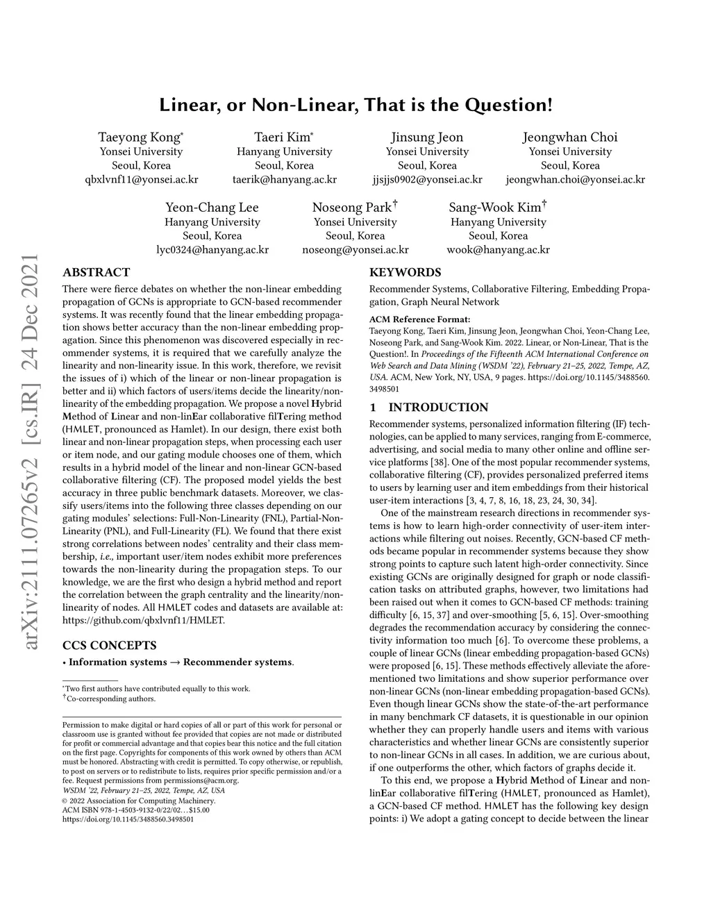 There were fierce debates on whether the non-linear embedding propagation of GCNs is appropriate to GCN-based recommender systems. It was recently found that the linear embedding propagation shows better accuracy than the non-linear embedding propagation. Since this phenomenon was discovered especially in recommender systems, it is required that we carefully analyze the linearity and non-linearity issue. In this work, therefore, we revisit the issues of i) which of the linear or non-linear propagation is better and ii) which factors of users/items decide the linearity/non-linearity of the embedding propagation. We propose a novel Hybrid Method of Linear and non-linEar collaborative filTering method (HMLET, pronounced as Hamlet). In our design, there exist both linear and non-linear propagation steps, when processing each user or item node, and our gating module chooses one of them, which results in a hybrid model of the linear and non-linear GCN-based collaborative filtering (CF). The proposed model yields the best accuracy in three public benchmark datasets. Moreover, we classify users/items into the following three classes depending on our gating modules' selections: Full-Non-Linearity (FNL), Partial-Non-Linearity (PNL), and Full-Linearity (FL). We found that there exist strong correlations between nodes' centrality and their class membership, i.e., important user/item nodes exhibit more preferences towards the non-linearity during the propagation steps. To our knowledge, we are the first who design a hybrid method and report the correlation between the graph centrality and the linearity/non-linearity of nodes. All HMLET codes and datasets are available at: https://github.com/qbxlvnf11/HMLET.