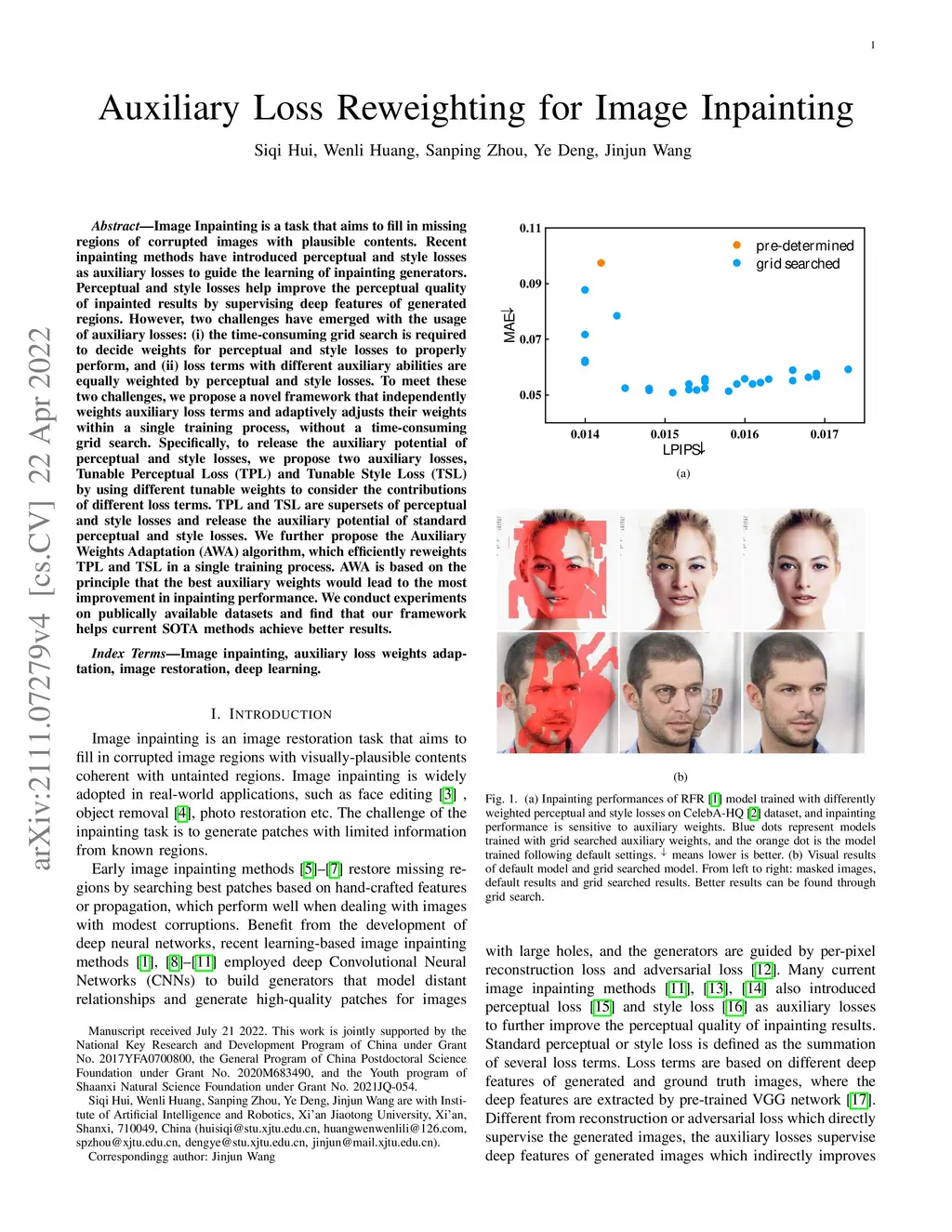 Image Inpainting is a task that aims to fill in missing regions of corrupted images with plausible contents. Recent inpainting methods have introduced perceptual and style losses as auxiliary losses to guide the learning of inpainting generators. Perceptual and style losses help improve the perceptual quality of inpainted results by supervising deep features of generated regions. However, two challenges have emerged with the usage of auxiliary losses: (i) the time-consuming grid search is required to decide weights for perceptual and style losses to properly perform, and (ii) loss terms with different auxiliary abilities are equally weighted by perceptual and style losses. To meet these two challenges, we propose a novel framework that independently weights auxiliary loss terms and adaptively adjusts their weights within a single training process, without a time-consuming grid search. Specifically, to release the auxiliary potential of perceptual and style losses, we propose two auxiliary losses, Tunable Perceptual Loss (TPL) and Tunable Style Loss (TSL) by using different tunable weights to consider the contributions of different loss terms. TPL and TSL are supersets of perceptual and style losses and release the auxiliary potential of standard perceptual and style losses. We further propose the Auxiliary Weights Adaptation (AWA) algorithm, which efficiently reweights TPL and TSL in a single training process. AWA is based on the principle that the best auxiliary weights would lead to the most improvement in inpainting performance. We conduct experiments on publically available datasets and find that our framework helps current SOTA methods achieve better results.