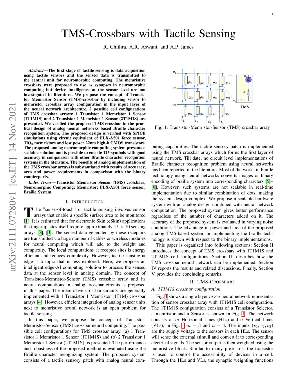 The first stage of tactile sensing is data acquisition using tactile sensors and the sensed data is transmitted to the central unit for neuromorphic computing. The memristive crossbars were proposed to use as synapses in neuromorphic computing but device intelligence at the sensor level are not investigated in literature. We propose the concept of Transistor Memristor Sensor (TMS)-crossbar by including sensor to memristor crossbar array configuration in the input layer of the neural network architecture. 2 possible cell configurations of TMS crossbar arrays: 1 Transistor 1 Memristor 1 Sensor (1T1M1S) and 2 Transistor 1 Memristor 1 Sensor (2T1M1S) are presented. We verified the proposed TMS-crossbar in the practical design of analog neural networks based Braille character recognition system. The proposed design is verified with SPICE simulations using circuit equivalent of FLX-A501 force sensor, TiO memristors and low power 22nm high-k CMOS transistors. The proposed analog neuromorphic computing system presents a scalable solution and is possible to encode 125 symbols with good accuracy in comparison with other Braille character recognition systems in the literature. The benefits of analog implementation of the TMS crossbar arrays is substantiated with results of accuracy, area and power requirements in comparison with the binary counterparts.